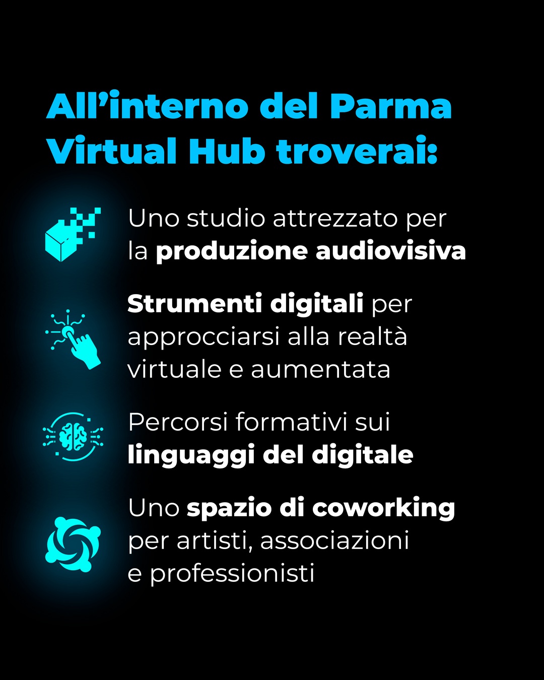 Parma Virtual Hub è un progetto dedicato ad artisti, performer e giovani creativi che vogliono esplorare le potenzialità espressive della XR – Extended Reality.