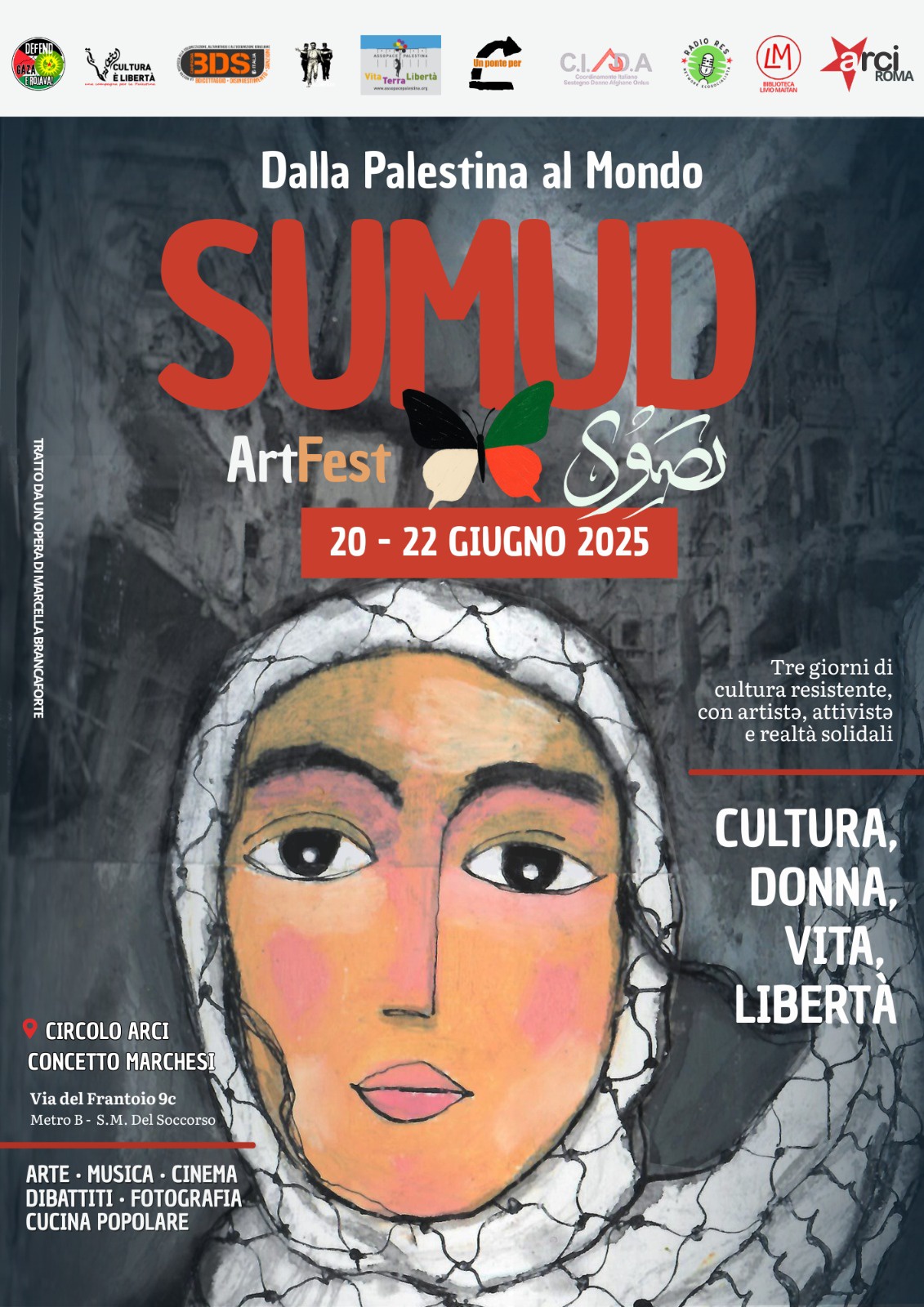 “SUMUD ARTFEST” è un festival multimediale che si terrà il 20, 21 e 22 giugno presso il Circolo Arci Concetto Marchesi a Roma. L'evento nasce dalla collaborazione tra diverse realtà impegnate nella solidarietà con il popolo palestinese, tra cui la Campagna Defend Gaza e Rojava, Un Ponte Per..., Gazzella, Cultura è Libertà, Assopace Palestina, Campagna BDS, CISDA e ARCI.