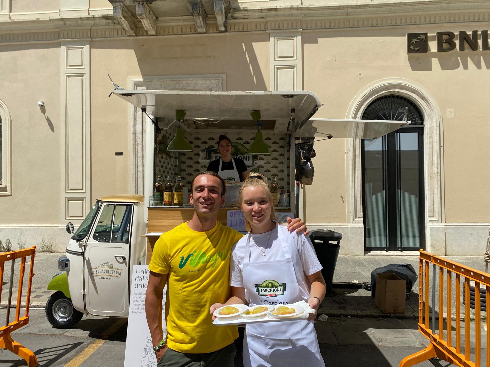 In foto, i ragazzi e ragazze che offrono in degustazione, al ministroAlessandra Locatelli, le bruschette con l'olio EVO INCLUSIVO in occasione del G7 sui diritti delle persone in condizione di disabilità al castello di Solfagnano (PG).