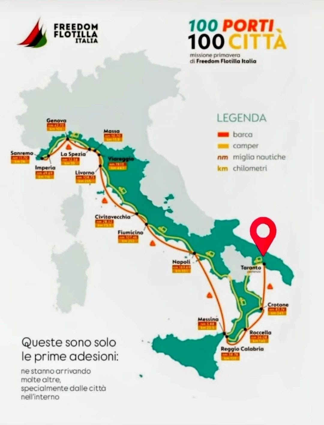 Dalla terra ferma al mare aperto: questo tour non serve solo a informare, ma a creare la base logistica e finanziaria indispensabile per rafforzare le nostre missioni in mare. Ogni piazza attivata, ogni risorsa raccolta e ogni legame stretto nei territori sono il carburante che permetterà alle navi della Freedom Flotilla di tornare a sfidare i blocchi, rompere l'assedio e portare solidarietà concreta alla popolazione palestinese.È