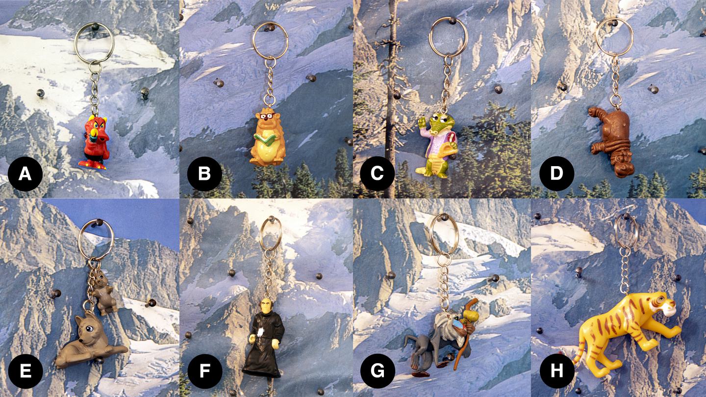 Portachiavi realizzati con oggetti di recupero, sorpresine Kinder, giocattoli vari.