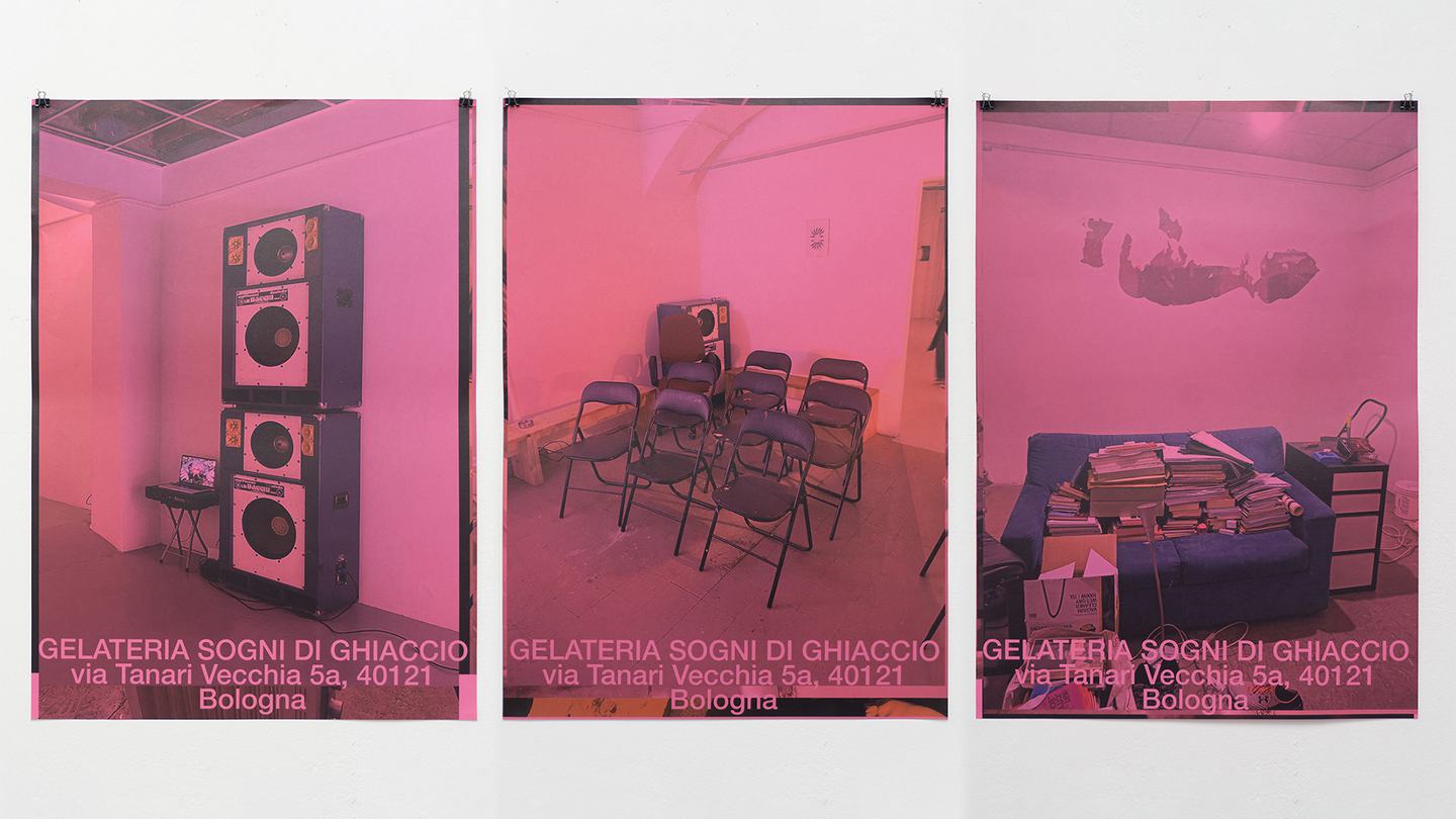 Gelateria Sogni di Ghiaccio apre nel 2016 come artist-run space e studio condiviso. Negli anni ha mutato forma, ma è sempre stata lì, nell’umidità di Via Tanari Vecchia. Dal 2024 ha preso la forma di un progetto collettivo, ed è di nuovo cambiata assieme alle persone che la animano e la attraversano.
