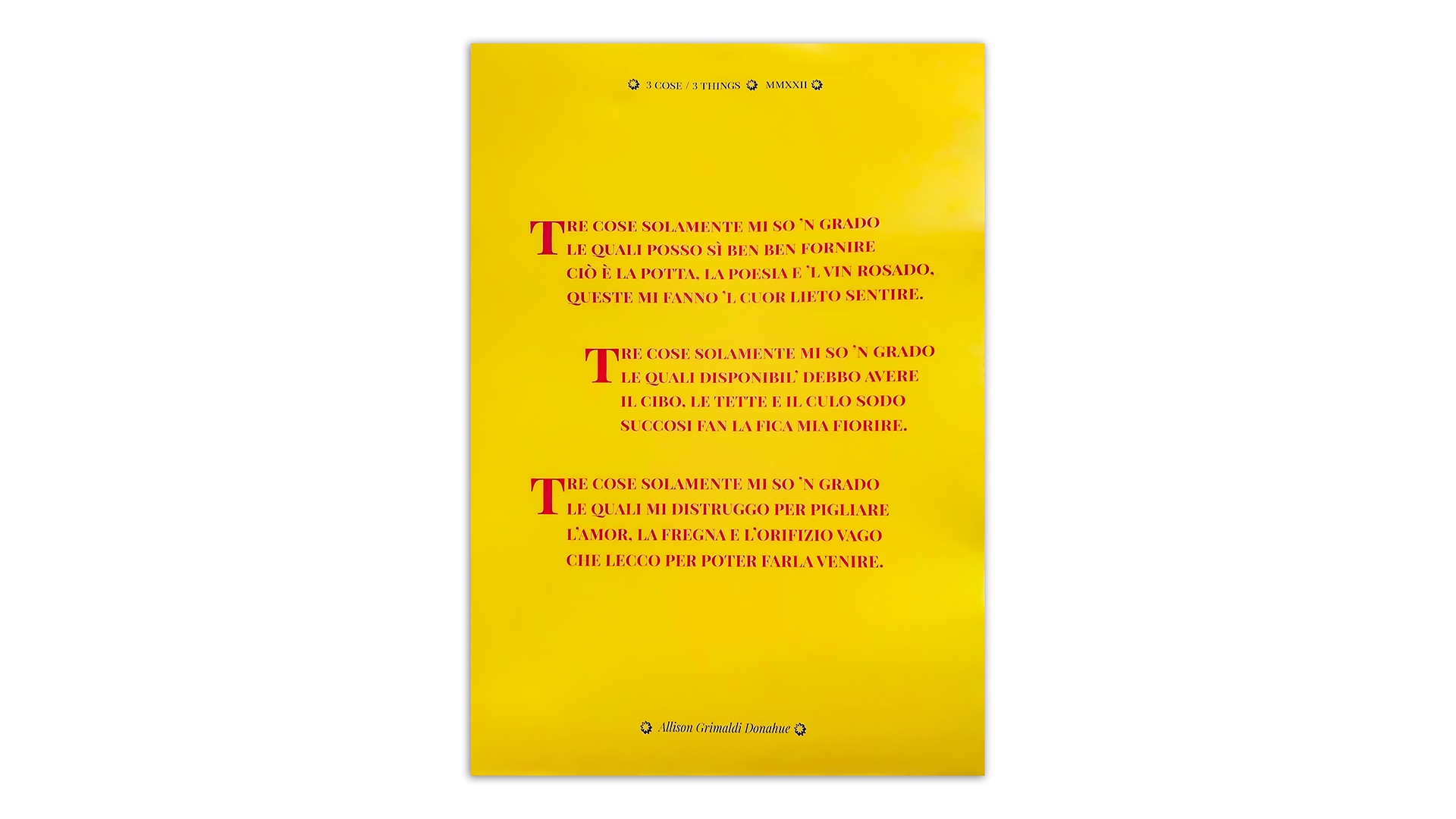 Poster giallo e rosso con una riscrittura di una poesia di Cecco Angiolieri tramite uno sguardo lesbo-erotico.