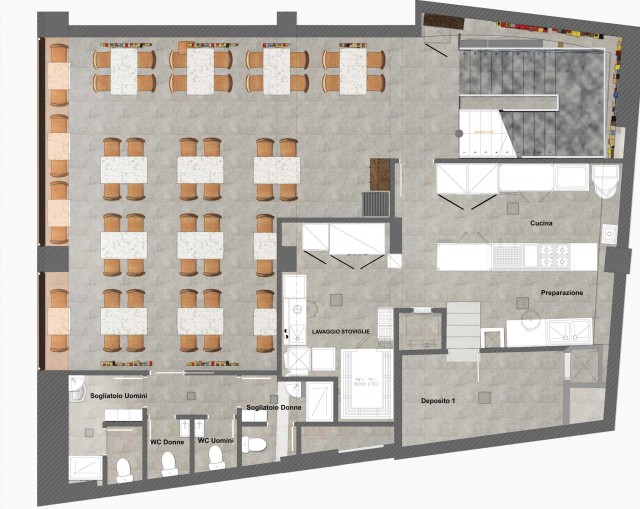 Il locale, strutturato su due piani vedrà il piano inferiore dedicato ad un servizio e una consumazione "veloce" del prodotto, con tavoli a muro e sgabelli. Il piano superiore invece, sarà l'anima del locale, una sala non eccessivamente grande, da poter contenere un buon numero di persone, così da creare un'atmosfera calda e rilassata, in un ambiente familiare.