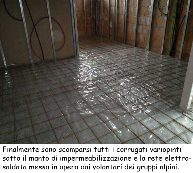 Con l'allestimento del piano rialzato si sono però esaurite le disponibilità finanziarie e solo l'aiuto significativo di tre amici degli Alpini ci ha consentito di predisporre nel nuovo piano superiore tutti i corrugati per l’impianto elettrico, l'intelaiatura di alluminio per il rivestimento in cartongesso di tutte le pareti e di completare il pavimento di oltre 350 mq. (a)