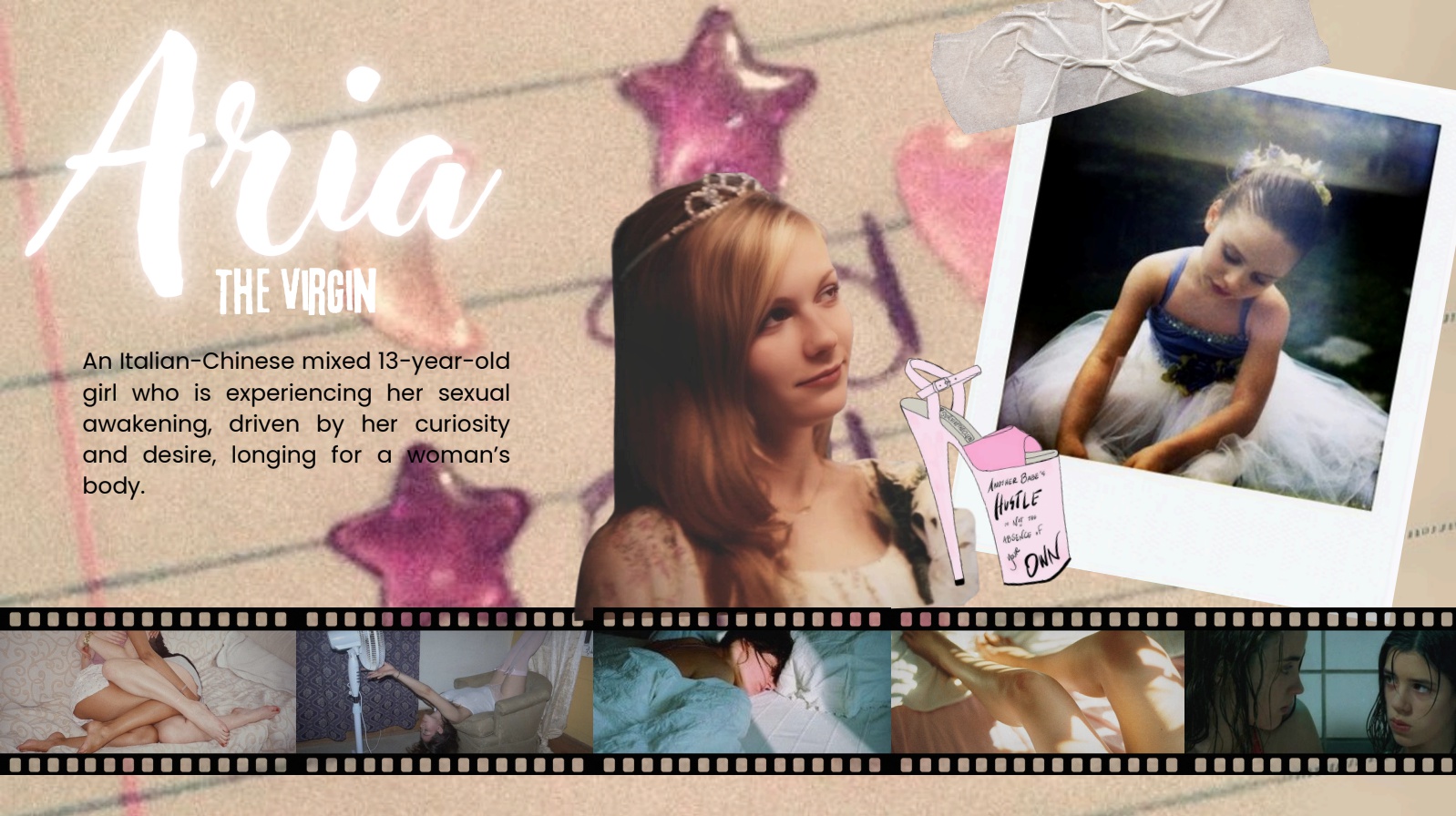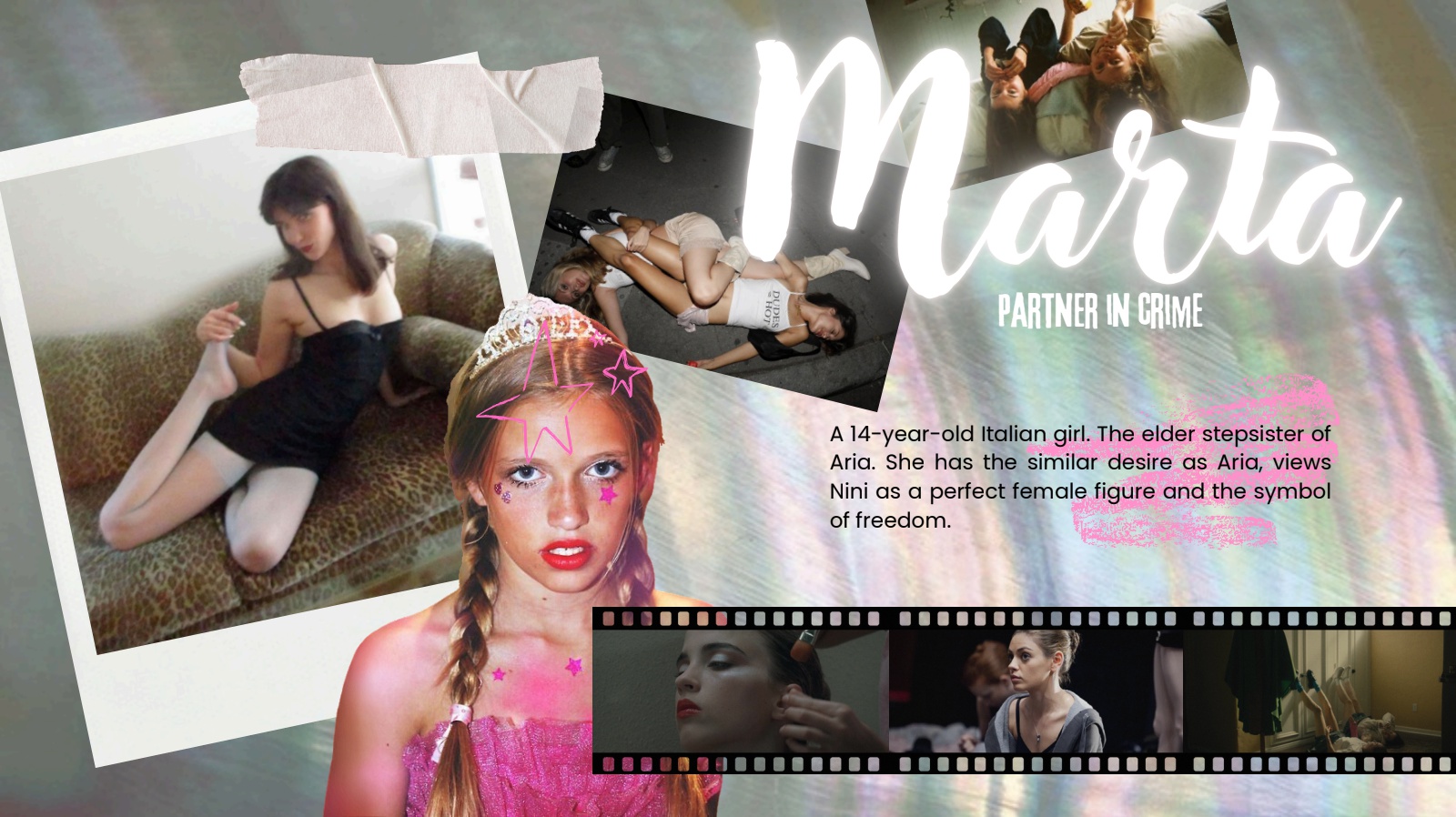 ENG: Aria's stepsister. She is curious, bold, and experiences adolescence as a game of imitation and challenges. She has the similar desire as Aria. She views Nini as a perfect female figure and the symbol of freedom. She’s like the child version of Nini, the “bad influence” who pulls Aria into her game of exploration and liberation.