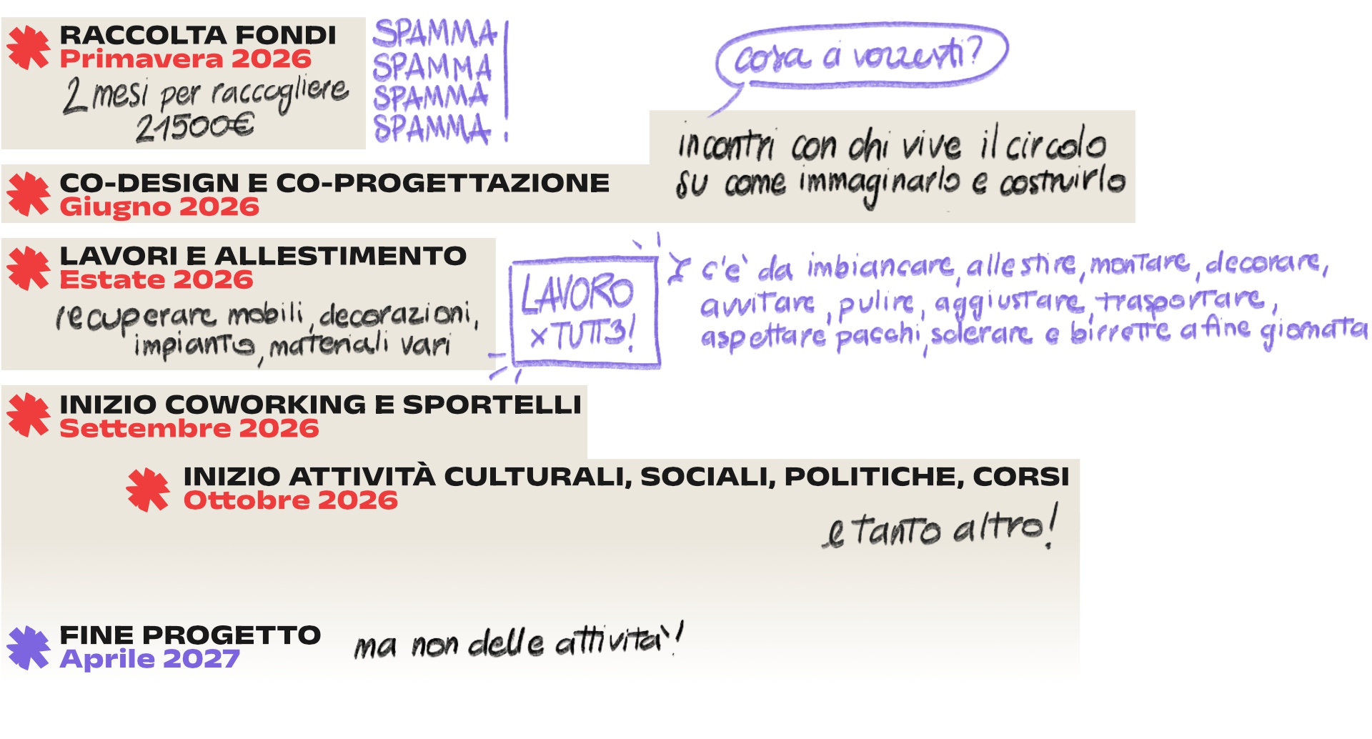 Con questo progetto vogliamo rispondere a una mancanza concreta: creare uno spazio aperto e accessibile, un luogo in cui non serva consumare per poter stare insieme. Uno spazio dove lavorare accanto ad altri, formarsi, chiedere aiuto, partecipare ad attività culturali e sentirsi parte di una comunità.