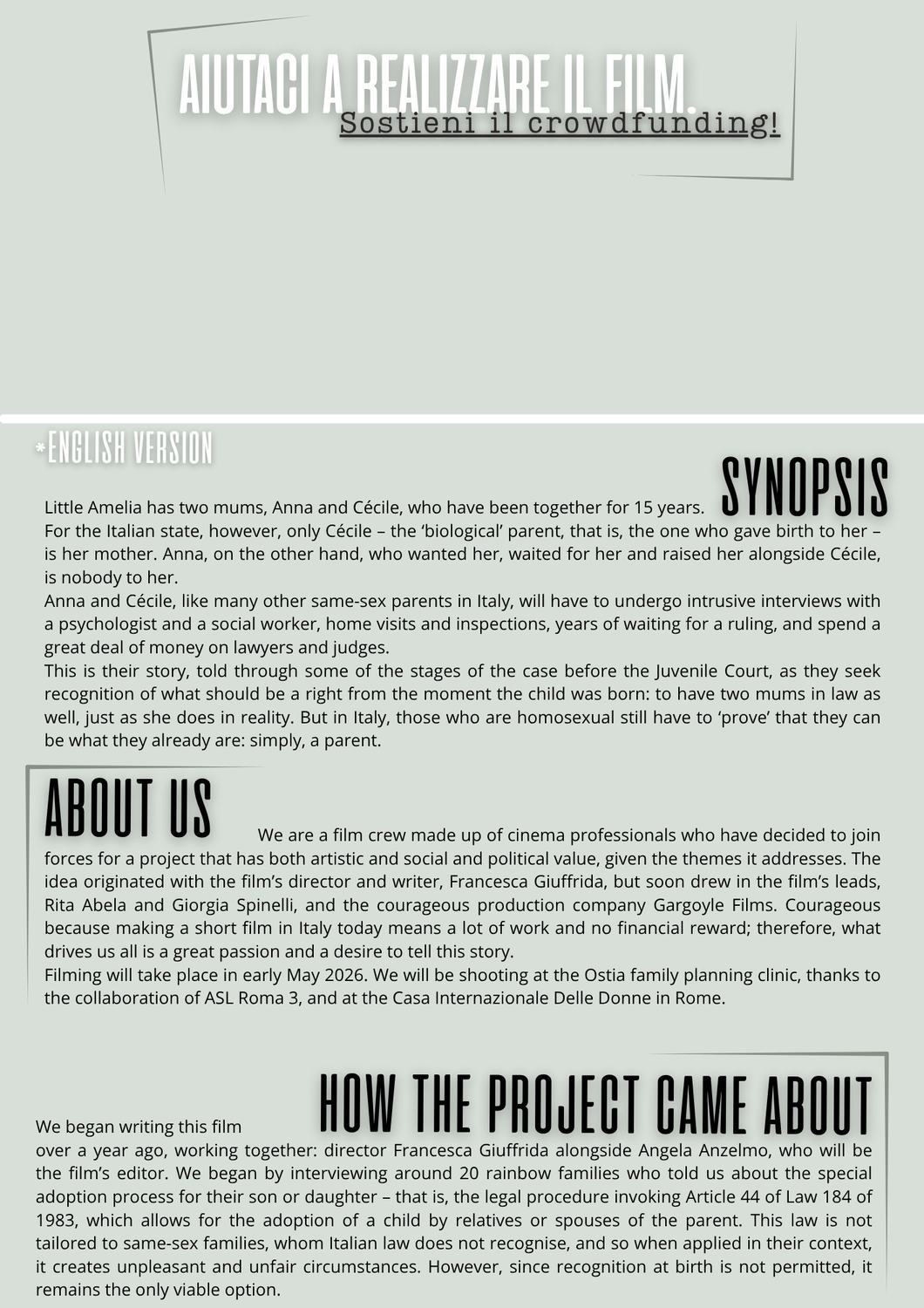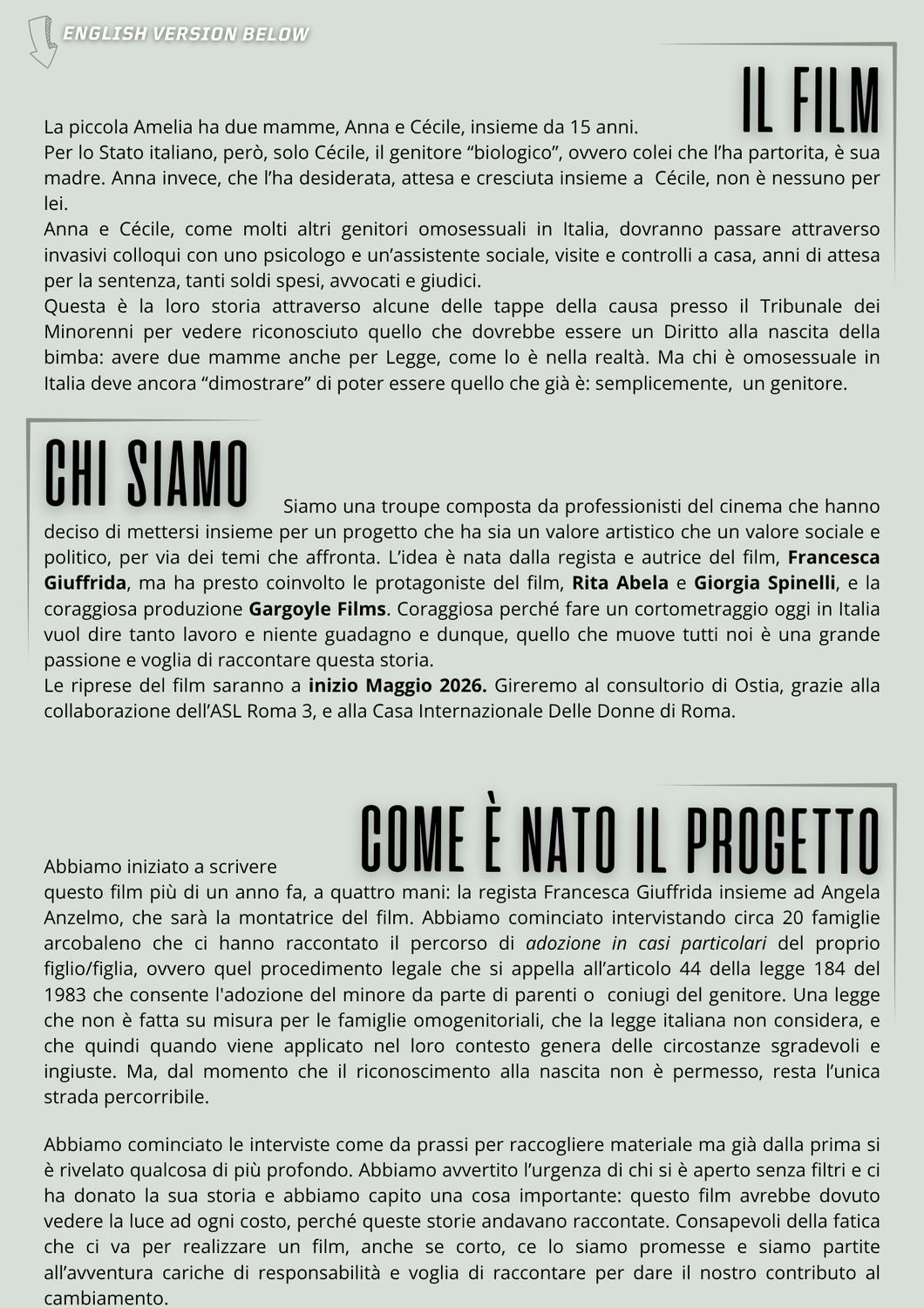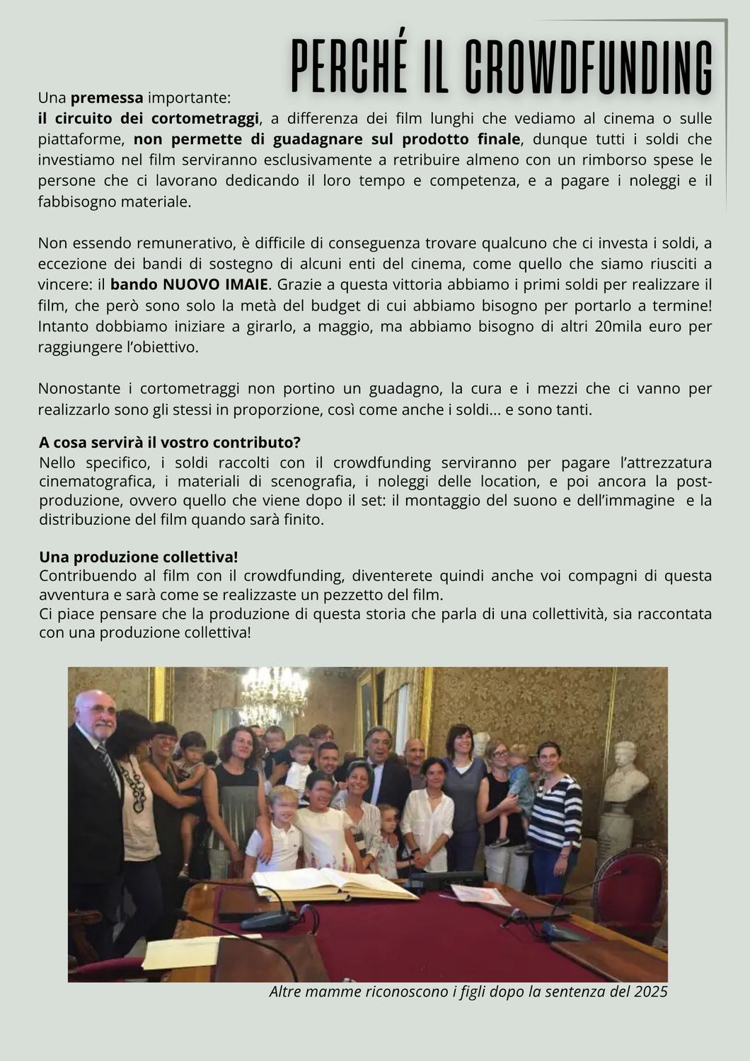 Aggiornamenti via email sull’avanzamento del progetto, menzione pubblica sui canali social del progetto, contenuti esclusivi behind-the-scenes e poster digitale, accesso allo streaming privato del cortometraggio prima della distribuzione pubblica.