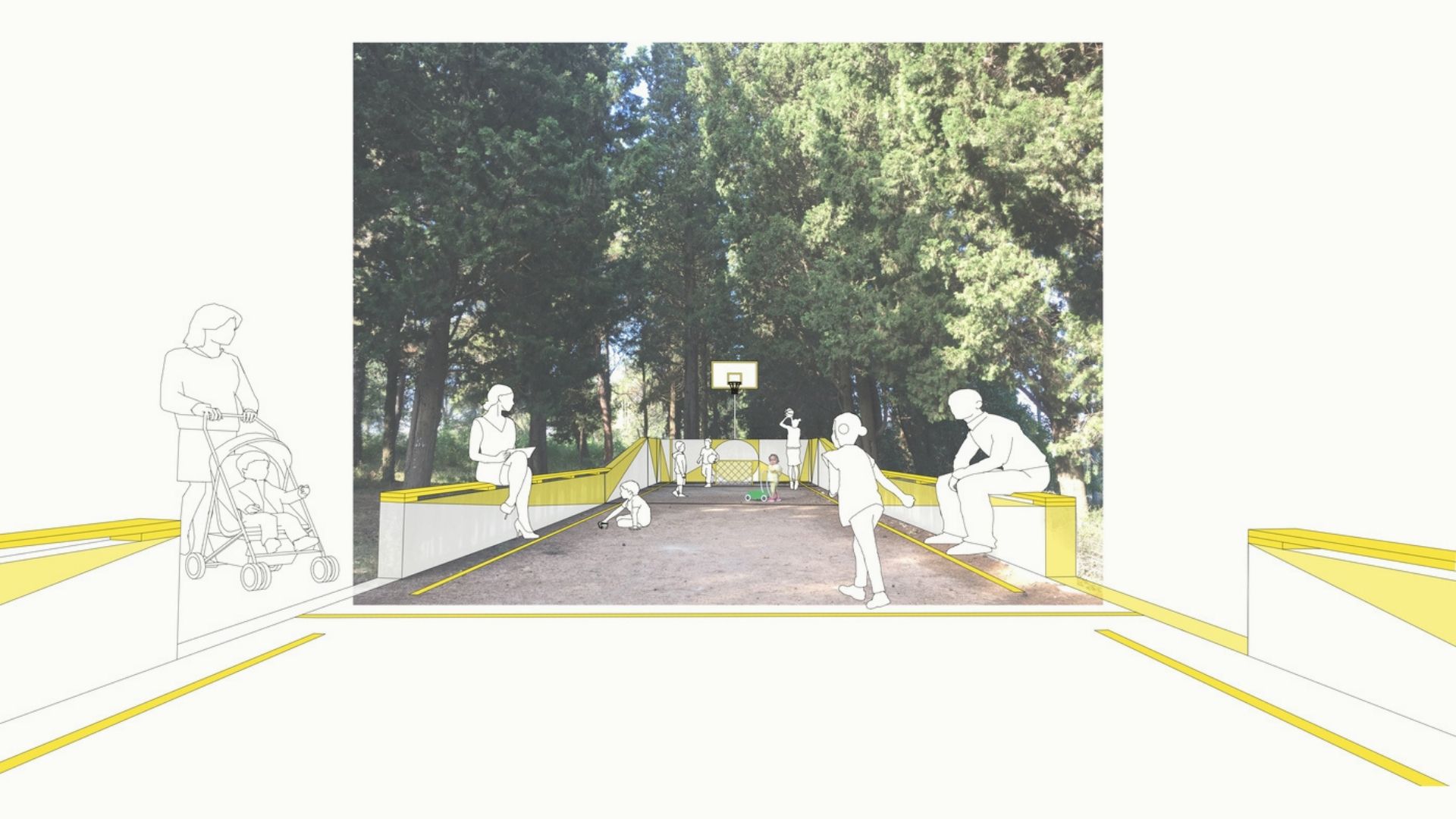 È in questo contesto che, “Zambrattia Playcourt” viene presentato come un esercizio di rigenerazione urbana di piccola scala che propone l’Iterazione fisica del campo da bocce in un Playcourt comunitario integrando nella forma già definita vari attività ludico sportive in cui il grande spazio centrale è diviso in due aree, in cui è possibile interagire attraverso il gioco. Queste due zone non sono separate, in quanto funzionano anche in senso longitudinale come un grande campo all’aperto, uno spazio flessibile che mantiene il suo programma primario di bocciodromo oltre ad essere uno spazio di riunione e d’incontro aperto a diverse possibilità aperto anche ad altri usi che la comunità può proporre, uno spazio che si unifica attraverso il colore bianco e giallo di un design che proviene dalle linee di campo, dando vita così ad un contenitore per il gioco e il tempo libero, in grado di assorbire completamente a chi gioca e isolarlo dal mondo esterno, e allo stesso tempo uno spazio di incontro per la comunità.
