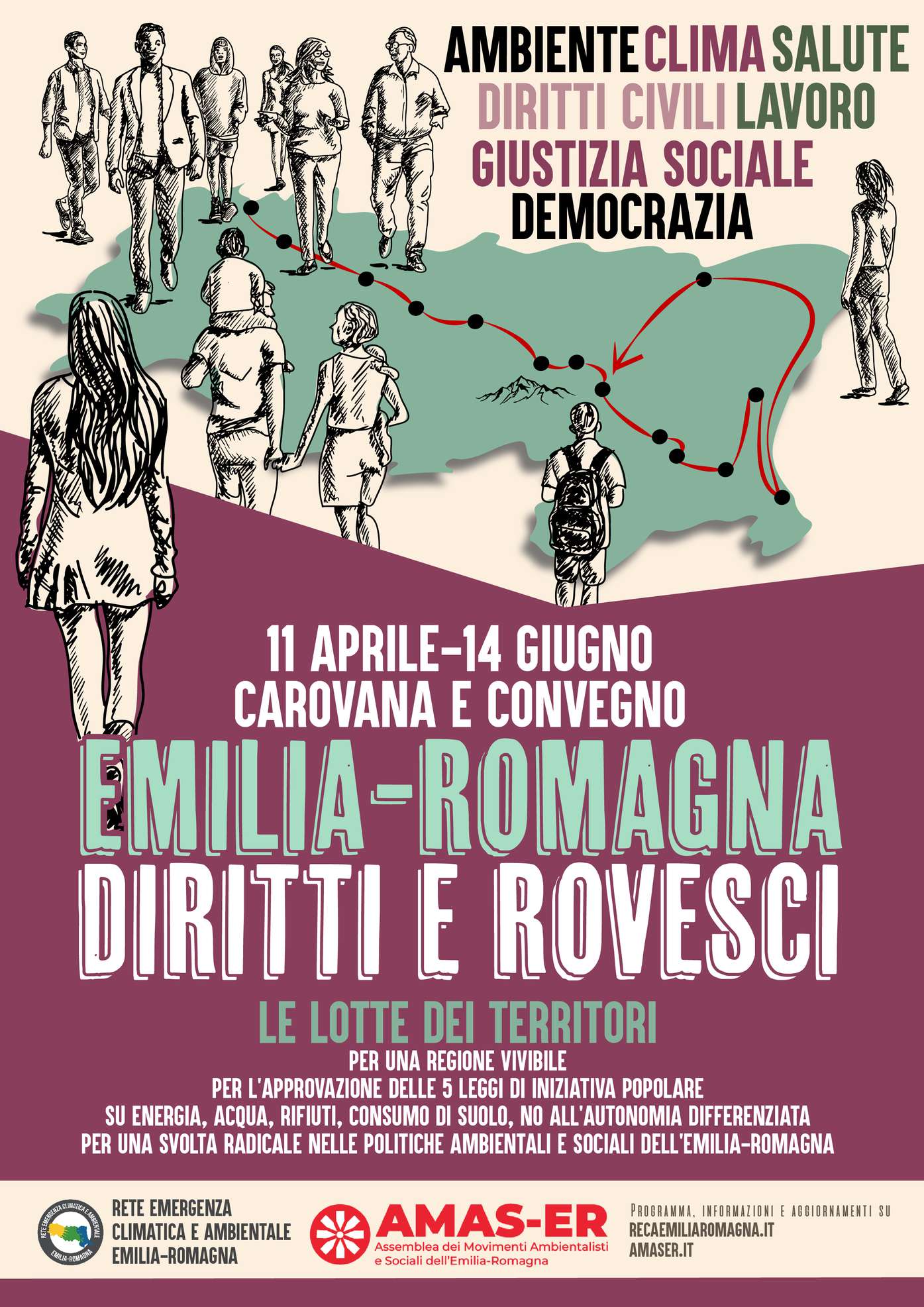 Come associazioni, comitati, collettivi e realtà sociali che ogni giorno si impegnano per denunciare e cambiare le politiche dannose per la salute, l’ambiente e la qualità di vita, abbiamo deciso di creare un’occasione per mostrare tutto il nostro lavoro attraverso una CAROVANA che partirà da Piacenza l’11 aprile per toccare poi tutti i capoluoghi di provincia e altre località significative, fino ad arrivare a Bologna il 13 e 14 giugno, dove si terrà un CONVEGNO per approfondire insieme tutte le tematiche affrontate, in cui costruiremo delle proposte concrete per affrontare la sfida ambientale, climatica e sociale.