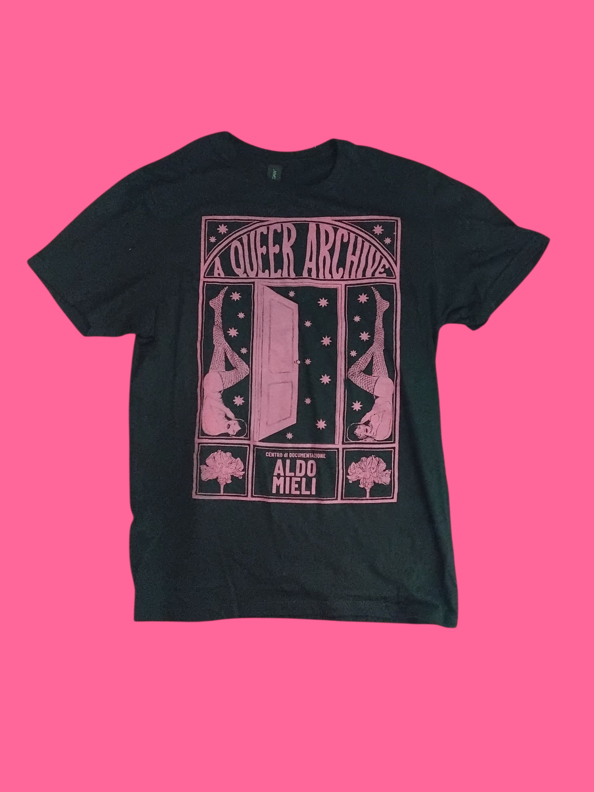 T-shirt "A queer archive", serigrafata e prodotta dalla Luce Rossa Lab di Carrara. Illustrazione di Lorenzo D'Alessandro.
