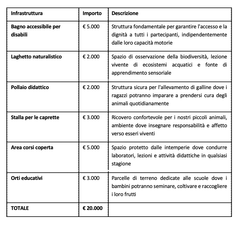 Ogni euro che raccoglieremo sarà investito direttamente per creare spazi sicuri, funzionali e accoglienti dove questa esperienza didattica possa realizzarsi pienamente. Ecco il dettaglio: