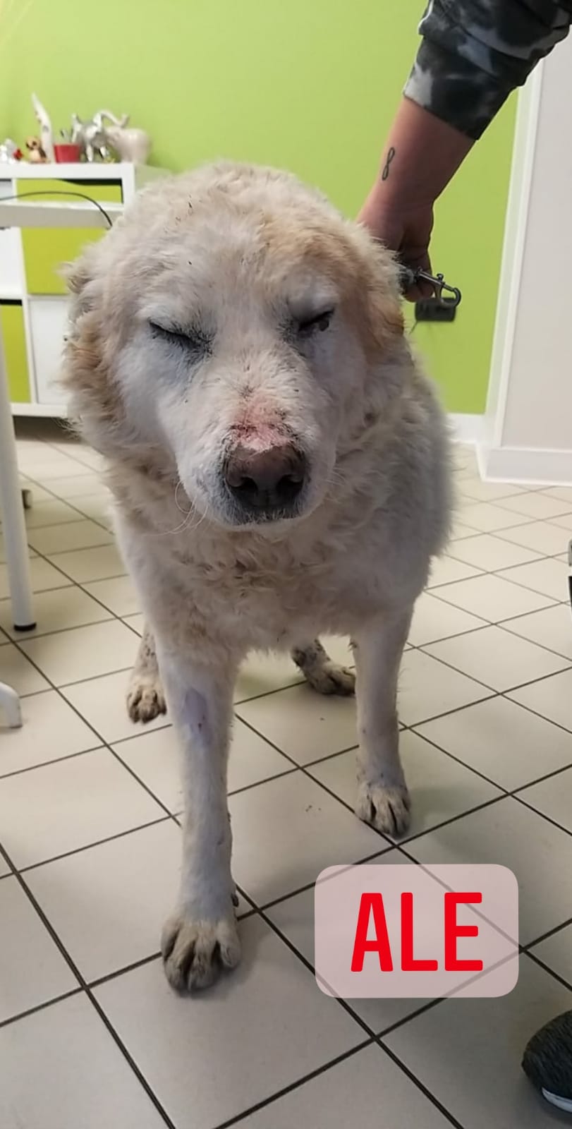 Ale, che nella foto (di un po' di tempo fa) ha gli occhietti chiusi e rovinati, è un'adozione davvero del cuore: purtroppo questo cucciolone amorevole e sfortunato è positivo alla Leishmania. Questo dolce "disastro" è un mix maremmano compatibile con tutti, ha solo un anno ed è stato recuperato la scorsa estate. Adesso il pelo gli sta ricrescendo e la leishmania la stiamo curando con non poca fatica. All'inizio i suoi valori non miglioravano, ma Ale è una pallottola di pelo bianco iper-resistente, con tanta voglia di farcela e tanta voglia di avere una famiglia tutta sua. Verrà affidato vaccinato e microchippato con iter preaffido e staffetta autorizzata ovunque ci sia una buona adozione per lui. Qualora foste interessati ad adottare Ale, mandate un messaggio al numero 3493655628. (ANGELA)