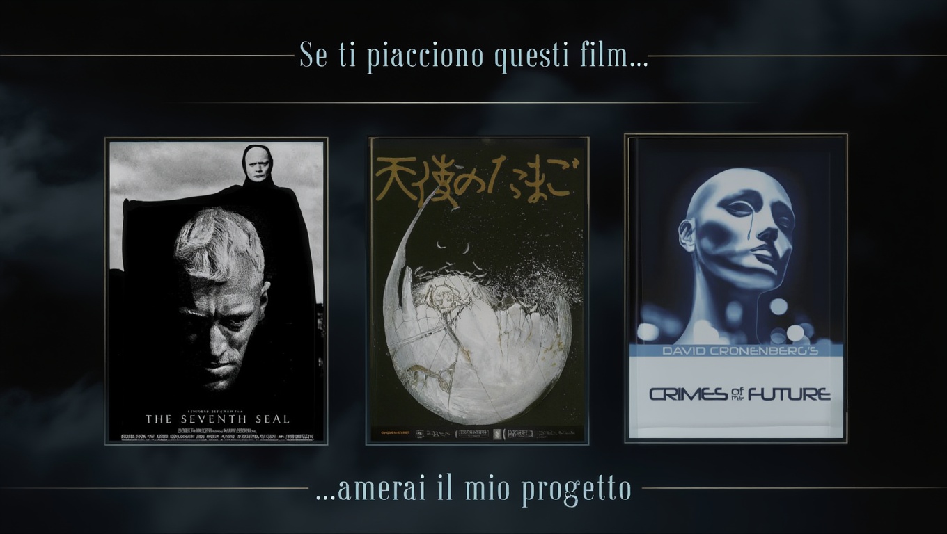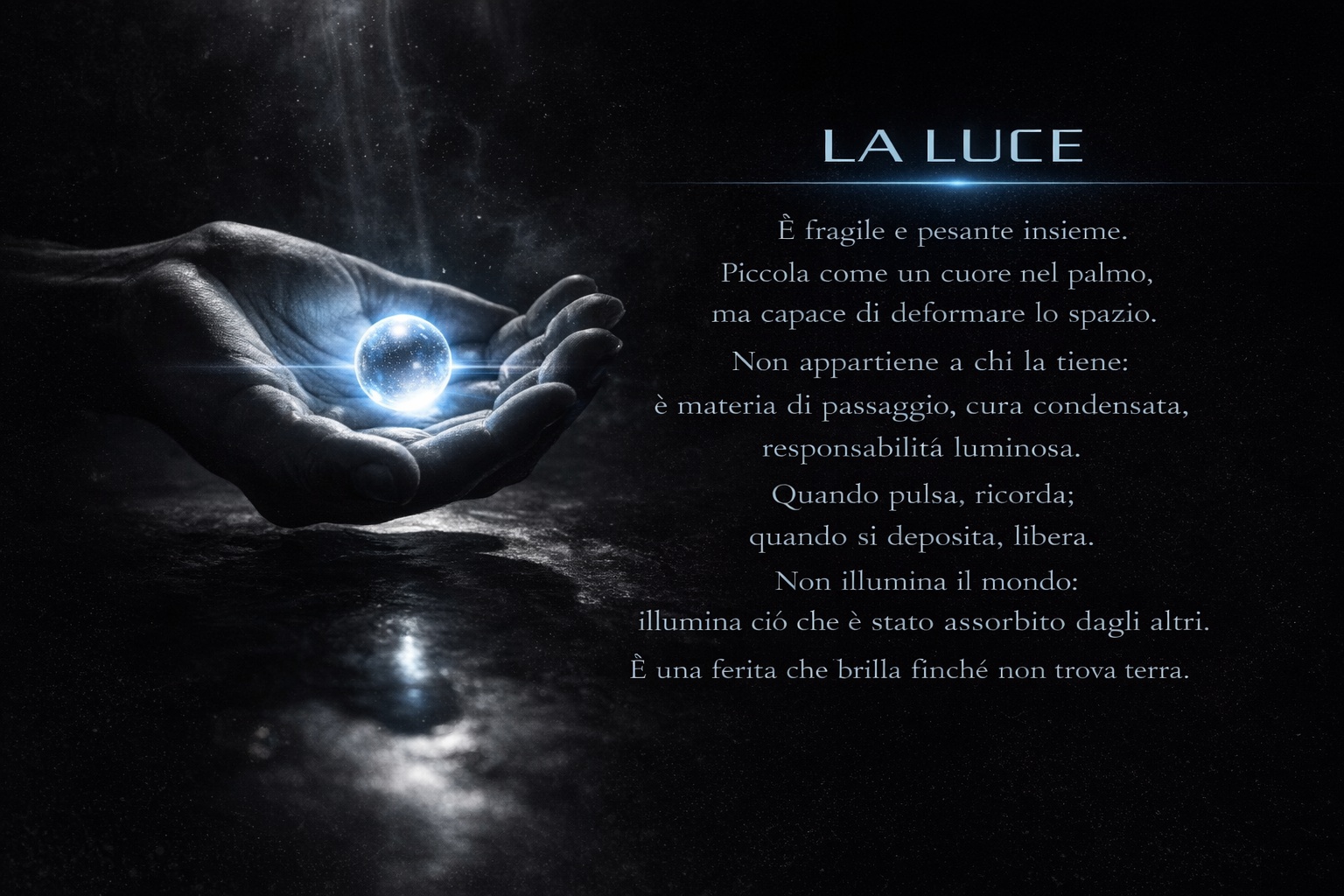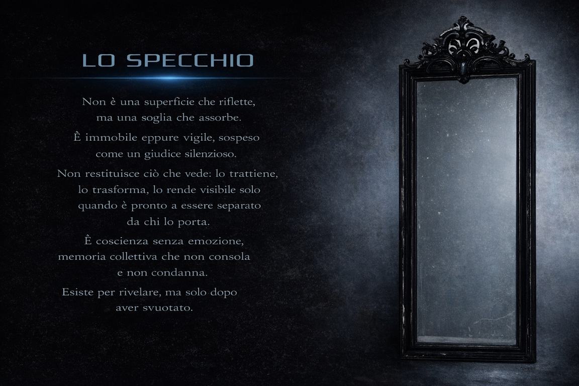 All’alba immobile di una pianura di sale nero, una figura incappucciata avanza verso un enorme specchio sospeso che non riflette: assorbe. Nel palmo tiene una sfera luminosa, pulsante come un cuore.