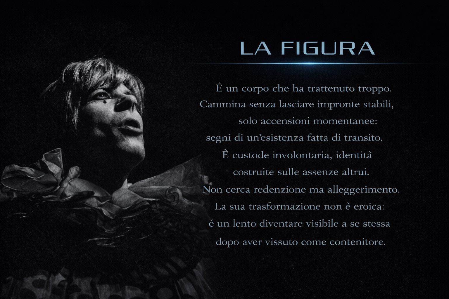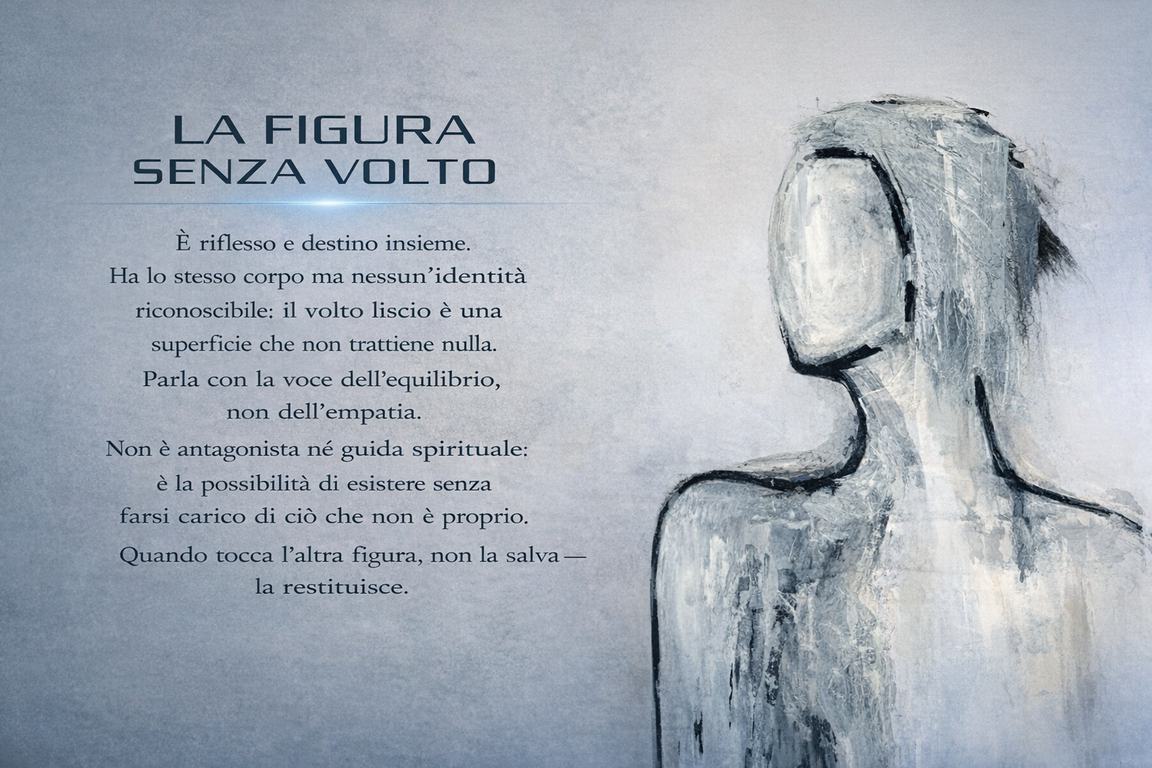 Attraverso un confronto sospeso tra visione e identità, la figura comprende che trattenere la luce significa trattenere anche le persone. Per restituirla dovrà deporla, accettando di non essere più il contenitore invisibile del peso altrui.