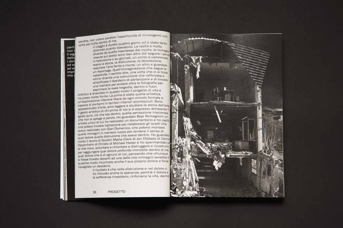 Il libro si riferisce alla mia produzione artistica cominciata con il reportage fotografico realizzato nelle aree del terremoto che ha colpito pesantemente il centro Italia nel 2016 con l'amico Gian Domenico. Quelle immagini di distruzione rappresentano il punto di partenza per una riflessione sul concetto di precarietà, sull’essere ‘in bilico’ e su ricostruzione / trasformazione attraverso la tecnica del collage. Pubblicato in due lingue (italiano e inglese), il libro inizia con una ricerca geologica realizzata su mappe e prosegue con la storia fotografica del viaggio verso le zone del terremoto. Quelle foto scattate sono poi state utilizzate, distrutte e rielaborate con una serie di diversi esperimenti. Le opere sono state esposte in Italia e all’estero.
