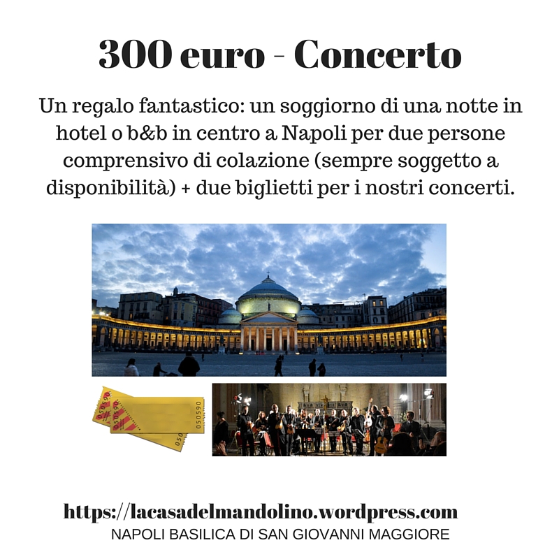 € 300 and more REWARD CONCERT - A fantastic gift: a one night stay in hotel or b&b in the center of Naples for two people including breakfast (always subject to availability) + two tickets to our concerts.