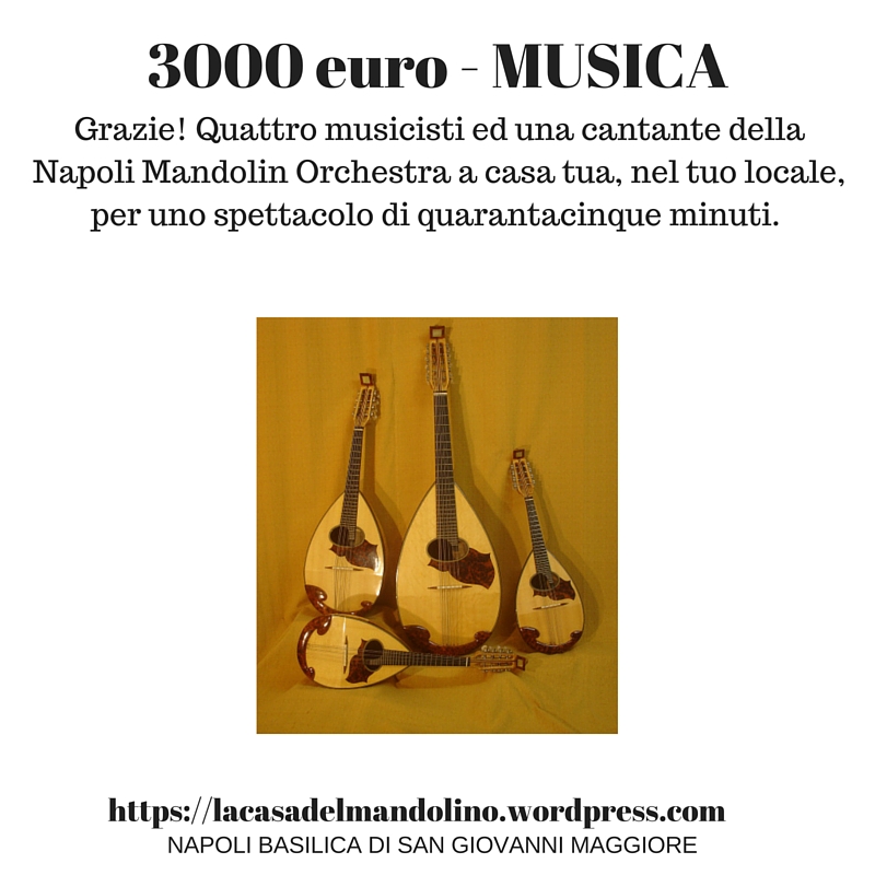 3.000 € e più RICOMPENSA MUSICA- Grazie! Quattro musicisti ed una cantante della Napoli Mandolin Orchestra a casa tua, nel tuo locale, per uno spettacolo di quarantacinque minuti.