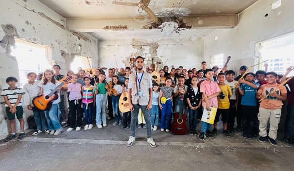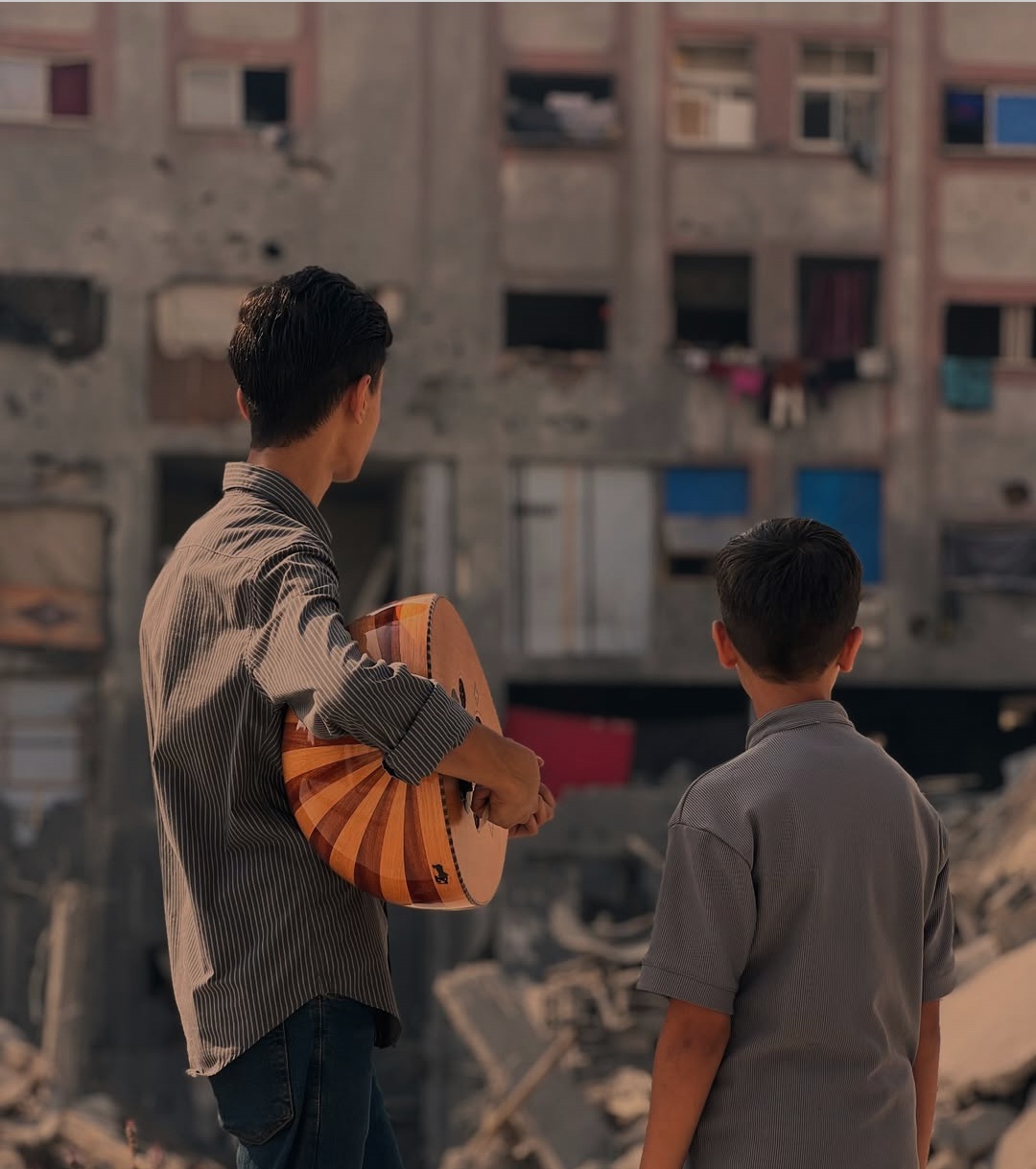 Fouad Khader, produttore musicale, ha visto lo studio che aveva costruito con anni di sacrifici ridotto in macerie da un bombardamento. È coordinatore delle attività del *Conservatorio Edward Said di Gaza e dirige cori di bambini.