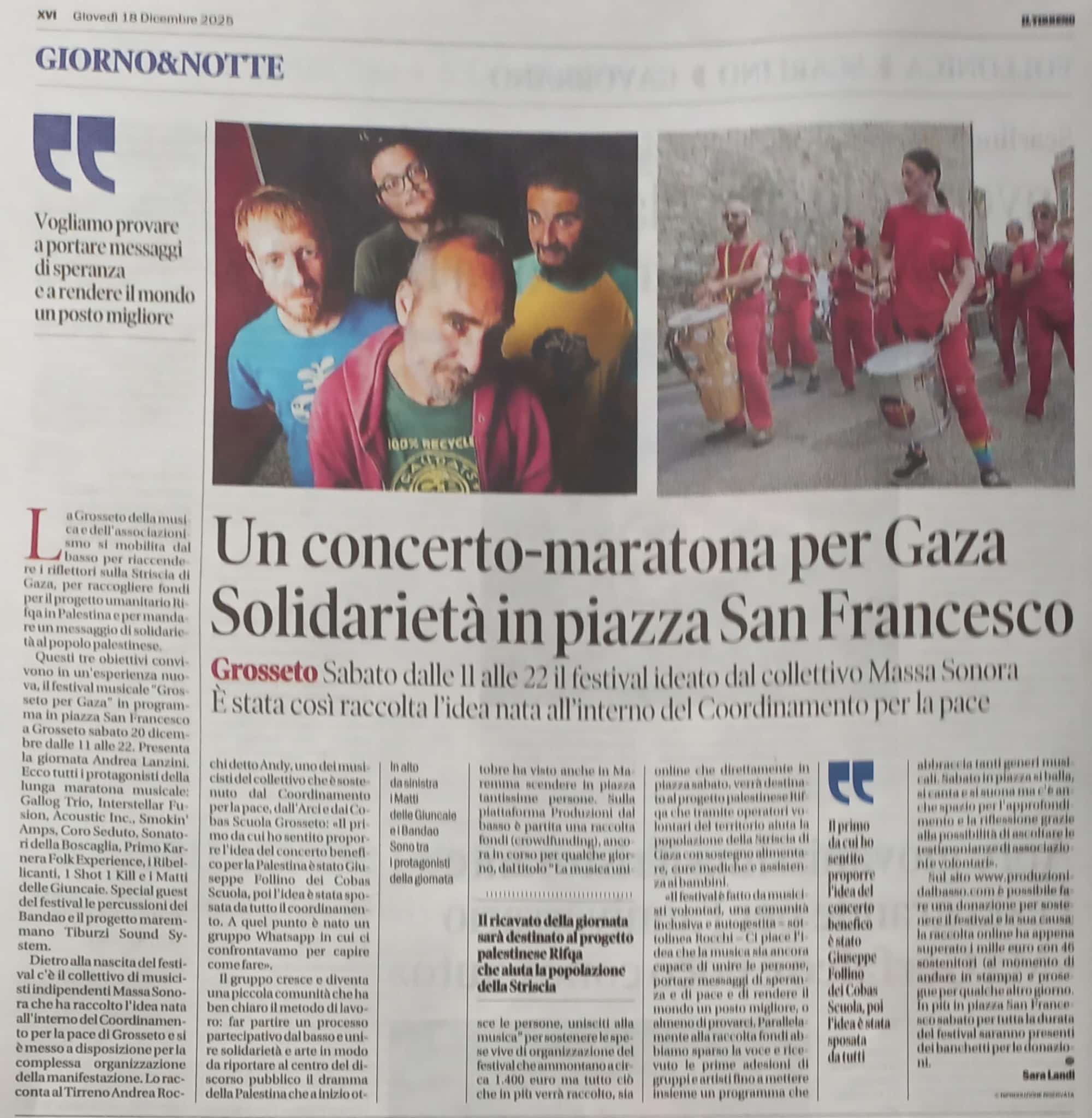 Sull'onda di questo entusiasmo, è nata una comunità di musicisti/e, sostenuta dal Coordinamento per la pace, Cobas Scuola e Arci , che vuole valorizzare la voglia di partecipazione che è tornata ad animare la città e contribuire a un processo di sensibilizzazzione e aiuto concreto per contrastare il genocidio del popolo palestinese attraverso la musica.