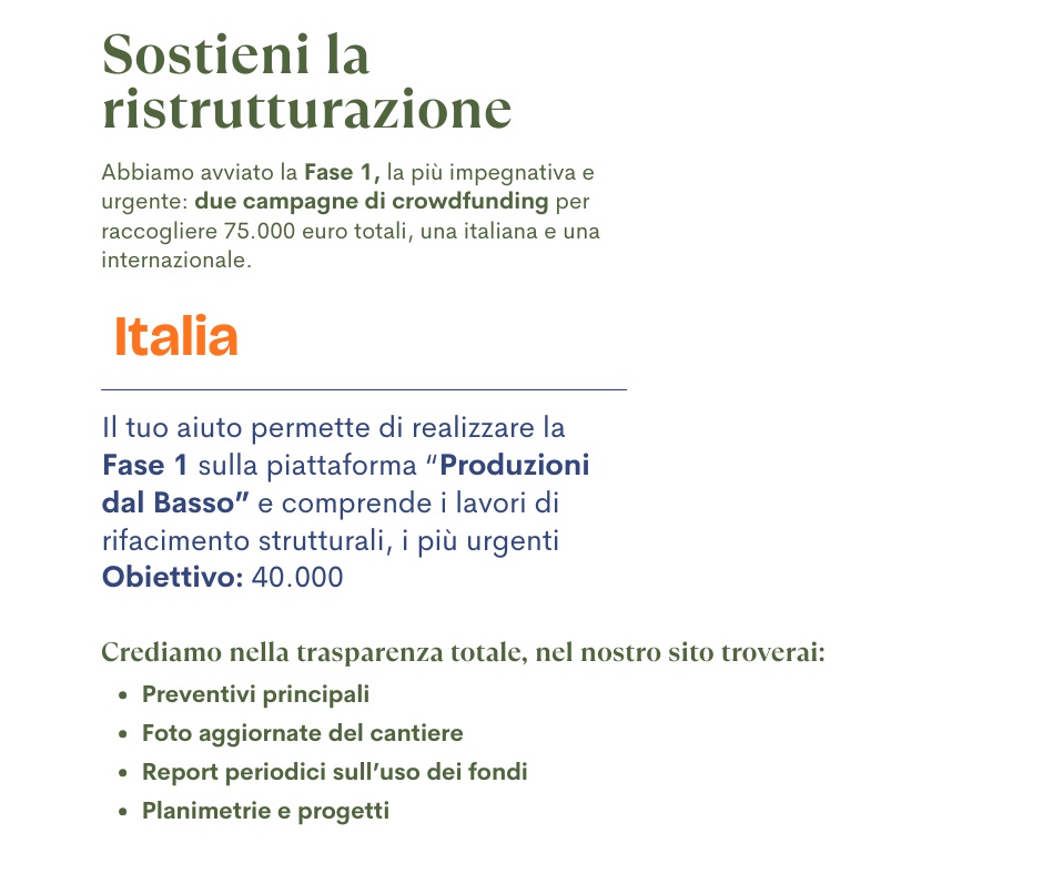 La Fase 1 è la parte più impegnativa e fondamentale di questo percorso, e potrà essere completata solo grazie all’aiuto di chi crede in un futuro fatto di connessione, cura e servizio.