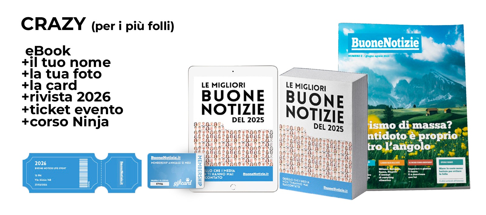 Alle ricompense precedenti puoi aggiungere anche l'abbonamento alla nostra rivista trimestrale, in versione digitale e cartacea, per rimanere informato per tutto il 2026 con le buone notizie selezionate per la rivista. Diventerai così un GOLD MEMBER con una donazione di 100€.