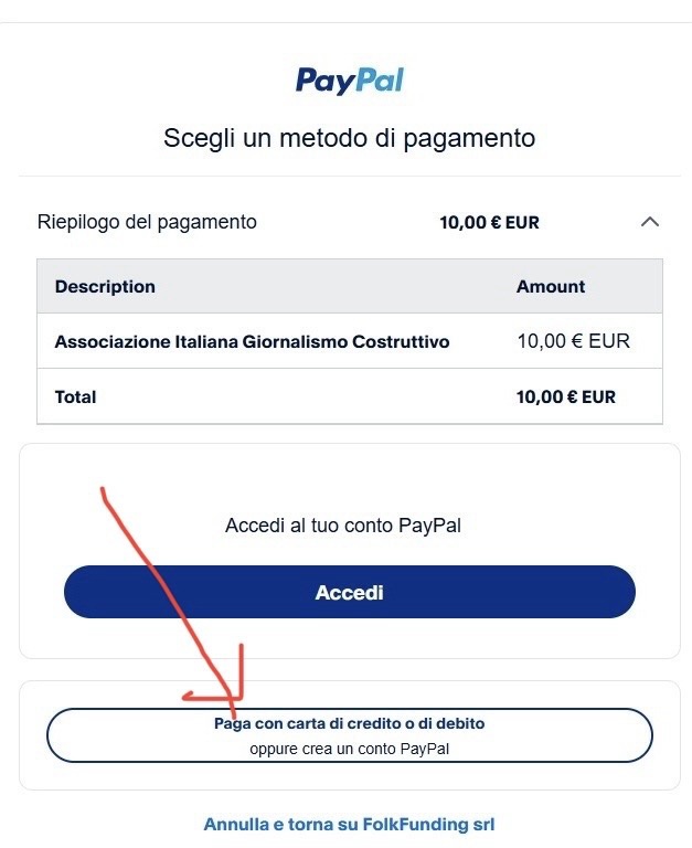 Puoi donare usando PayPal o carta di credito o debito (ovvero la tua carta Bancomat). Per donare con carta di credito, seleziona comunque PayPal, e nella schermata successiva (vedi immagine qui sotto) scegli di pagare con carta…