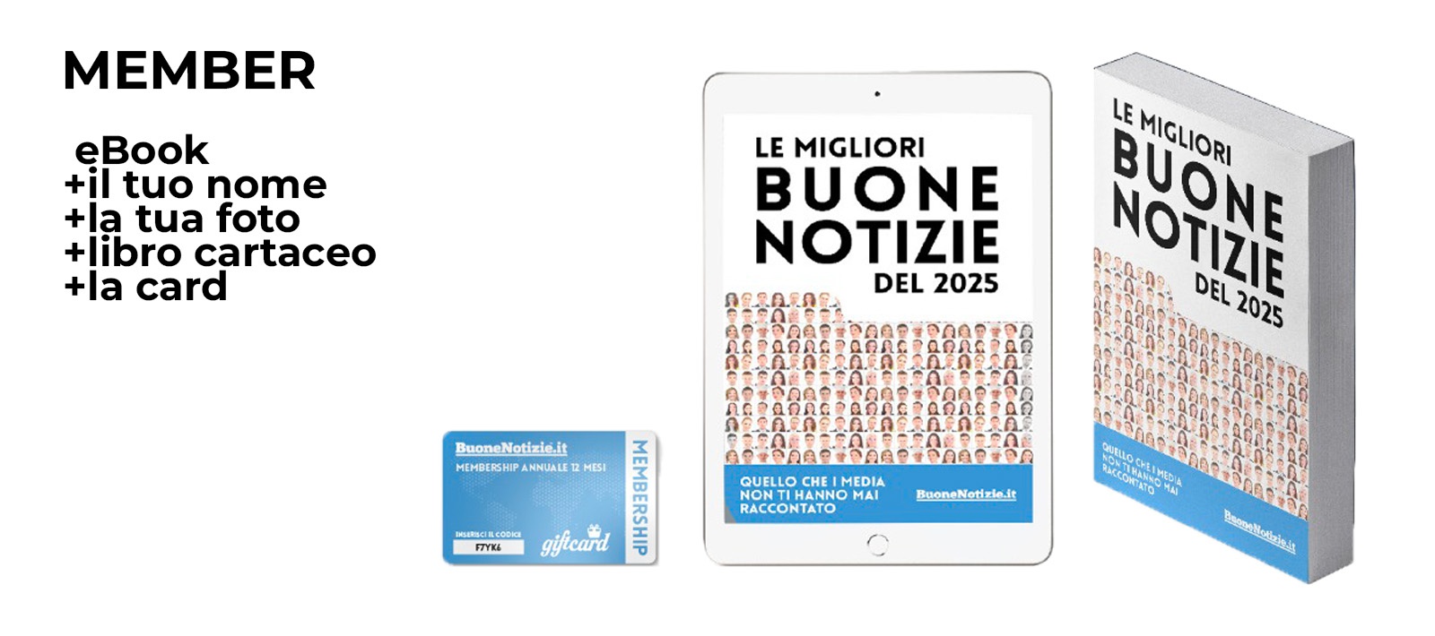 Oltre al librocon le migliori buone notizie del 2025, la campagna ti dà la possibilità di diventare un MEMBER con una donazione di 50€, ricevendo anche l'accesso esclusivo a tutte le notizie sul sito BuoneNotizie.it, incluse quelle riservate ai lettori Premum, per tutto il 2026. Lamembership è una card con un codice valido 12 mesi per accedere al sito e ti sarà spedita insieme al libro.