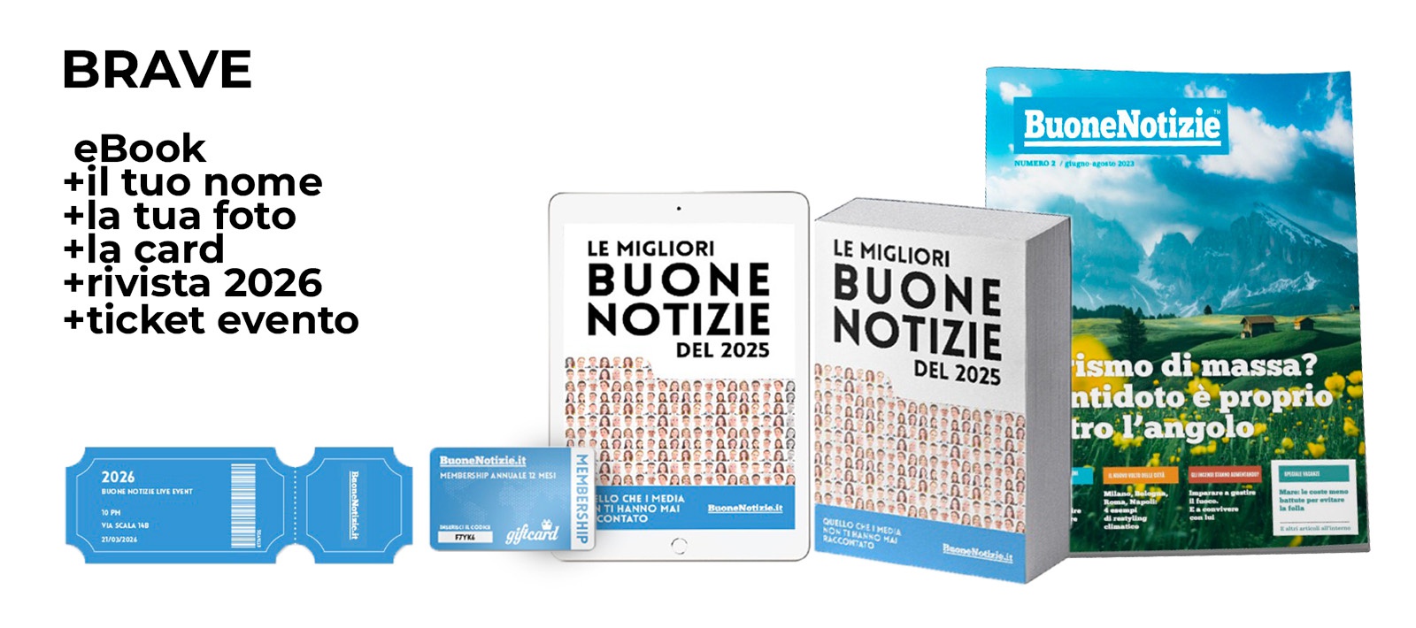 Un libro con le migliori buone notizie del 2025 e, se vorrai rimanere aggiornato con le migliori buone notizie anche nel 2026, un abbonamento annuale alla rivista trimestrale e una membership digitaleper ricevere buone notizie tutto l'anno