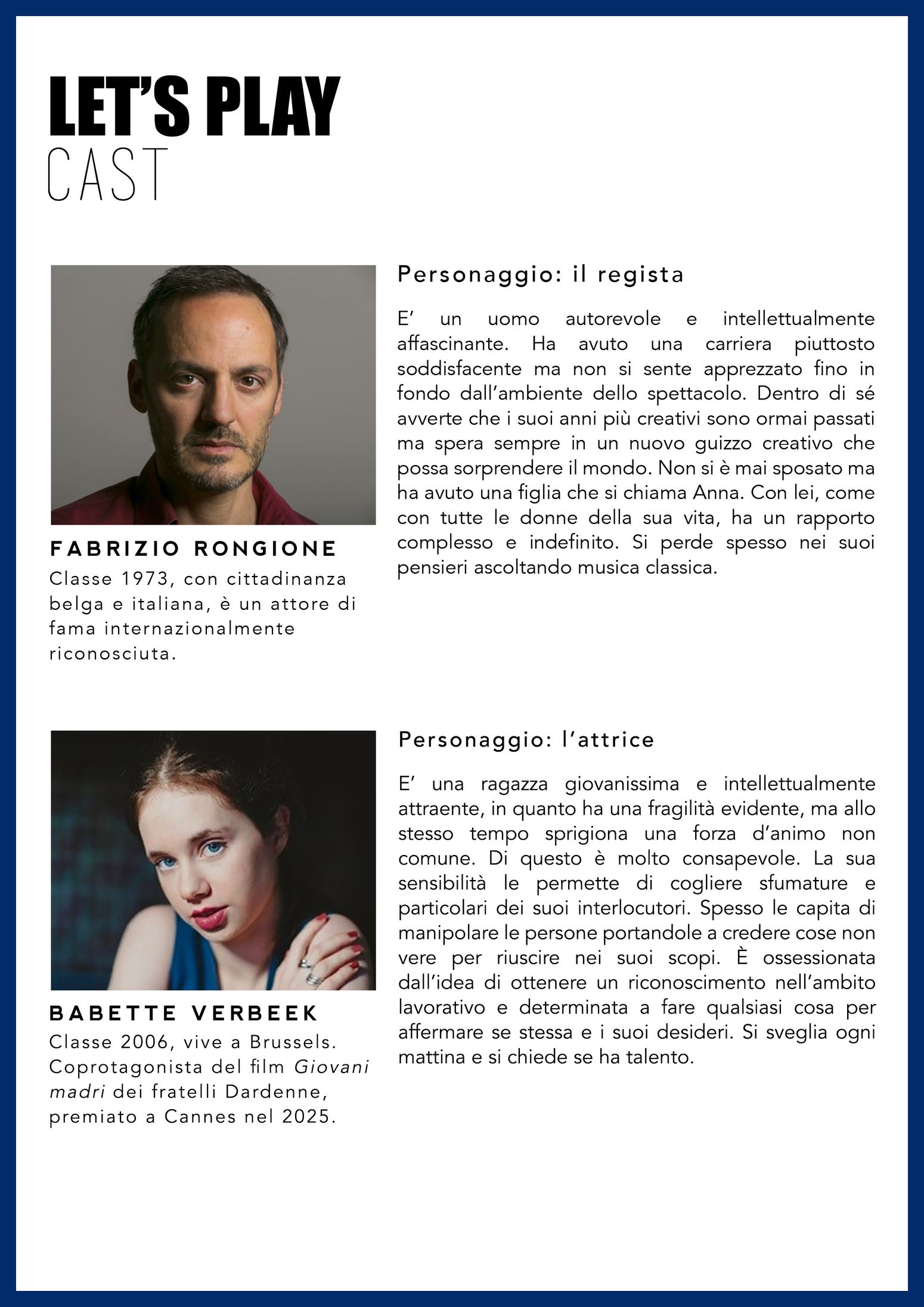 La sceneggiatura è stata scritta da Caroline Baglioni, un’autrice di grande talento già pluripremiata e molto conosciuta, e gli interpreti del film saranno due attori di fama internazionale, Fabrizio Rongione e Babette Verbeek.