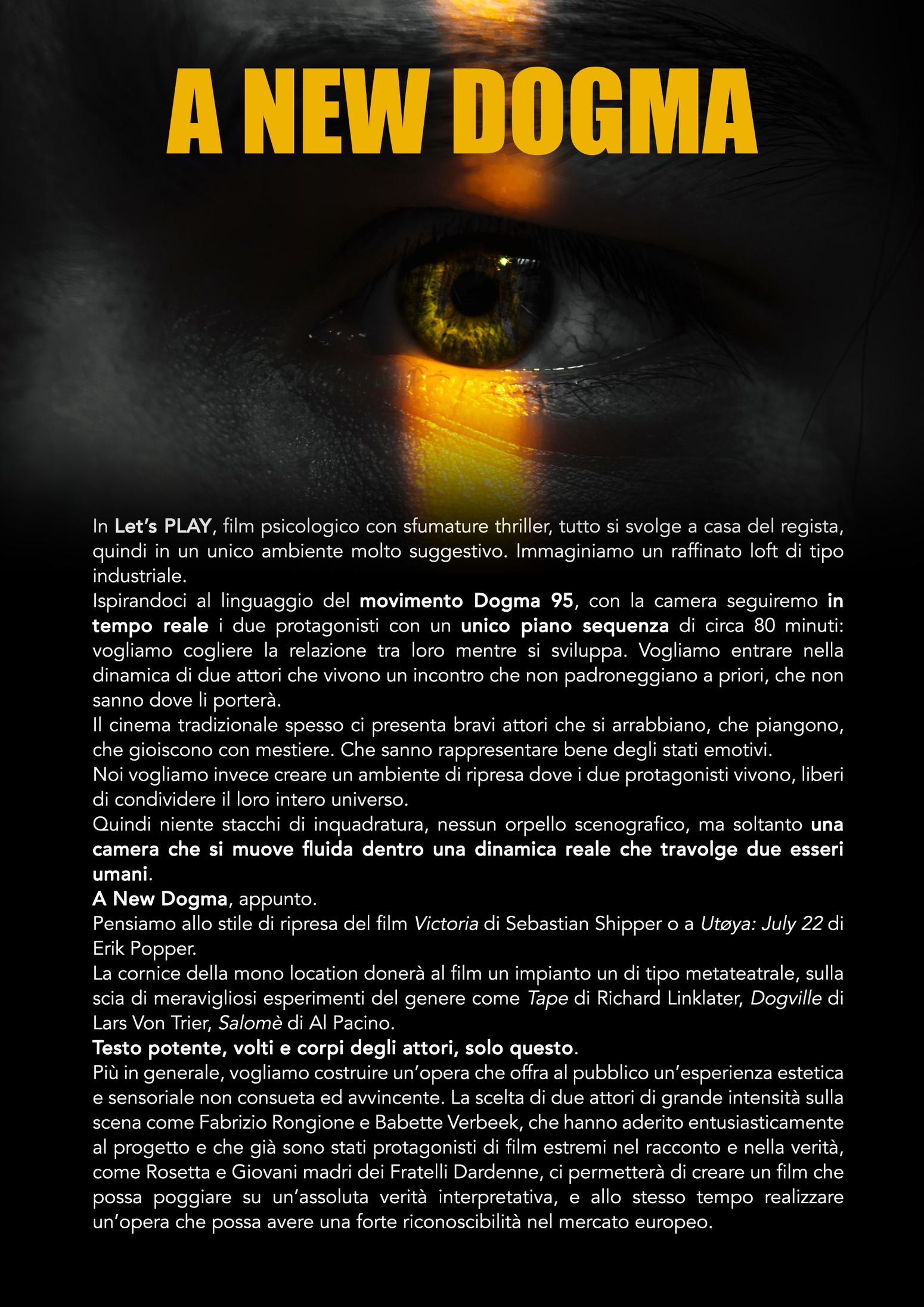 Noi, da appassionati di filmografia del tempo reale, da cultori della verità e dell’intensità della performance attoriale, vogliamo girare questo film riprendendo il linguaggio del celebre movimento DOGMA 95, rielaborandolo e attualizzandolo in un nuovo manifesto artistico e in una nuova modalità creativa, che abbiamo chiamato A NEW DOGMA.