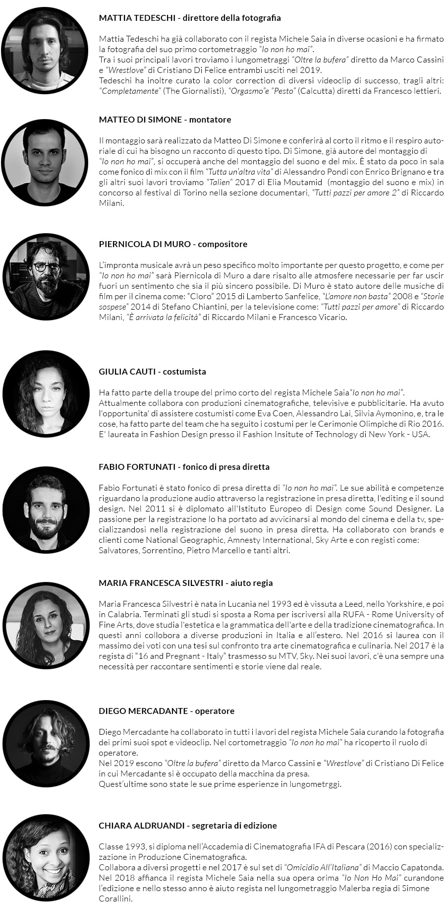 Questa è la troupe che lavorerà alla produzione e alla post-produzione di "Libera uscita". Gran parte parte di loro, come vedrete, ha già collaborato con il regista Michele Saia nel suo precedente cortometraggio.