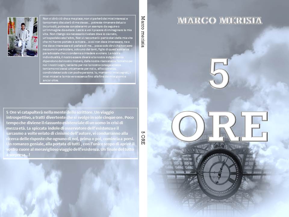 Il nostro obiettivo è quello di presentare, da nord a sud Italia ( e magari anche oltre), il suo primo irriverente capolavoro che da pochi giorni è in vendita : “5 Ore”. La storia racconta il viaggio che il protagonista, un cinico scrittore fallito, intraprende per cambiare la sua vita... forse! Un libro fresco, capace di farvi viaggiare e sorridere, nonché forte di una profonda analisi interiore.