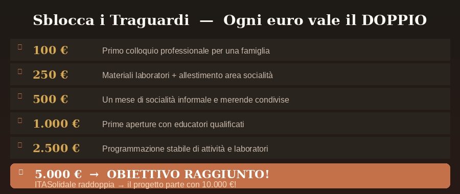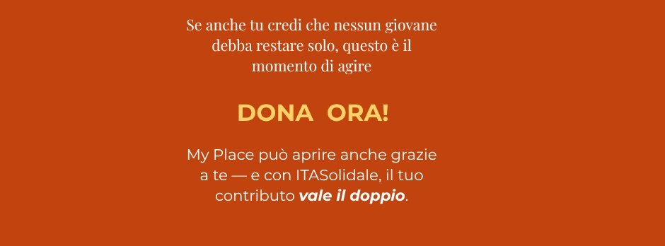 Ogni donazione sblocca qualcosa di concreto: i tuoi 20€ comprano il divano dove Luca si siede per la prima volta. I tuoi 100€ finanziano il primo colloquio per una famiglia. I tuoi 500€ tengono aperto My Place per un mese intero."