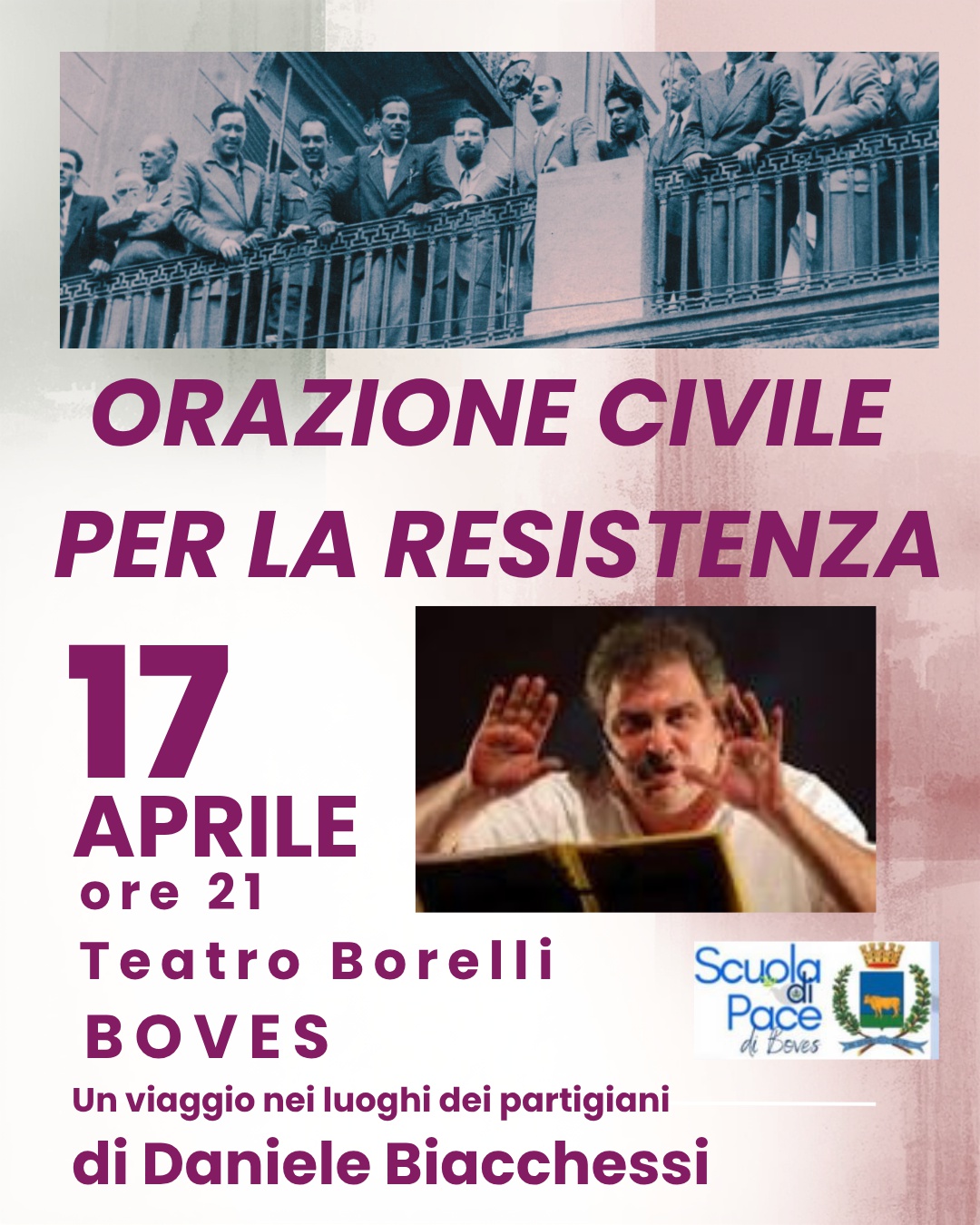 17/04/25. Boves, Auditorium Teatro Borelli, Piazza Borelli,ore 21. Daniele Biacchessi in "Orazione civile per la Resistenza" in versione solista. Organizzazione: Coordinamento della Scuola di Pace di Boves.