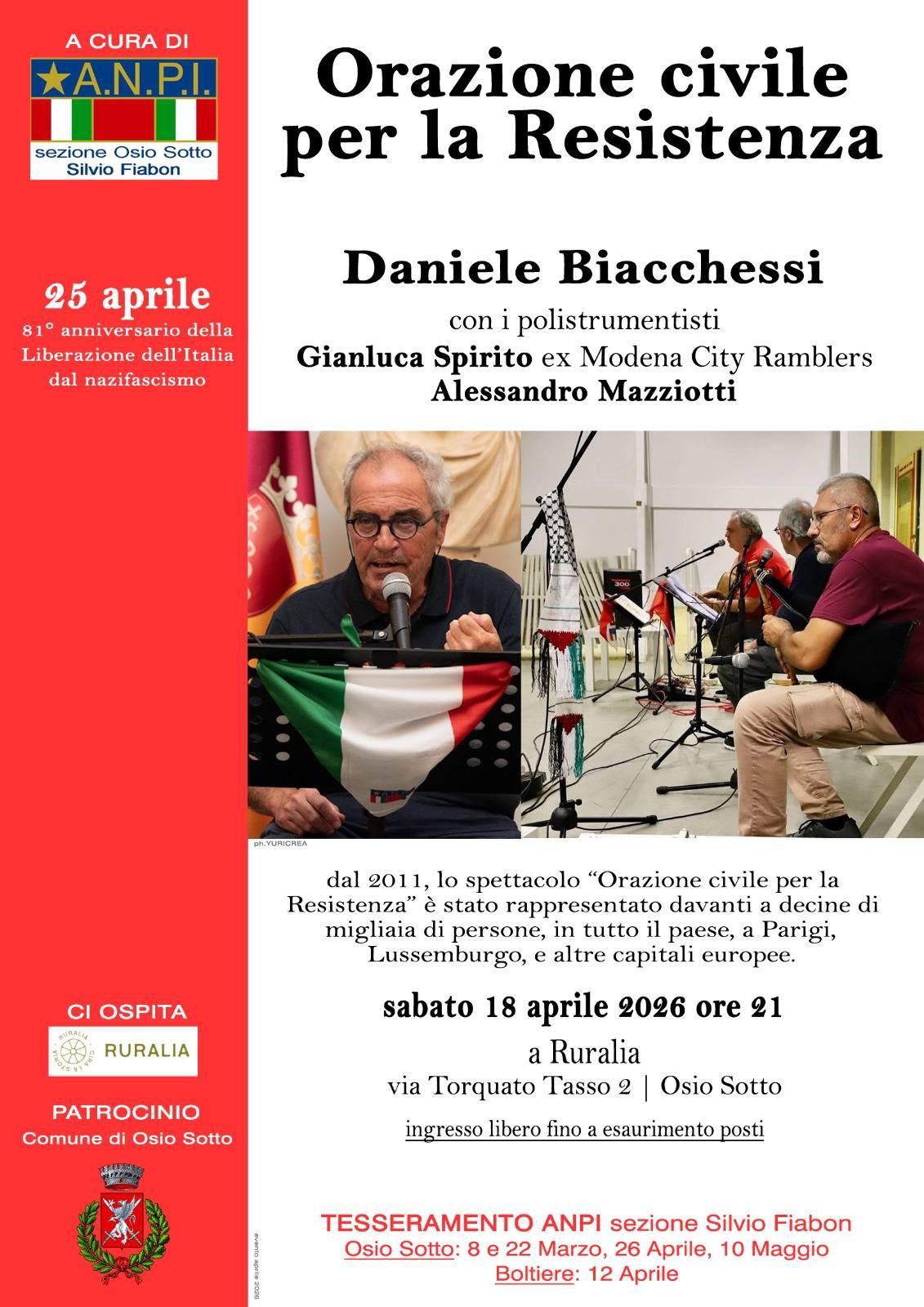 18/04/26. Osio sotto, Ruralia, ore 21. Daniele Biacchessi in "Orazione civile per la Resistenza" con Gianluca Spirito ex Modena City Ramblers, Alessandro Mazziotti. Organizzazione: Anpi Osio sotto.