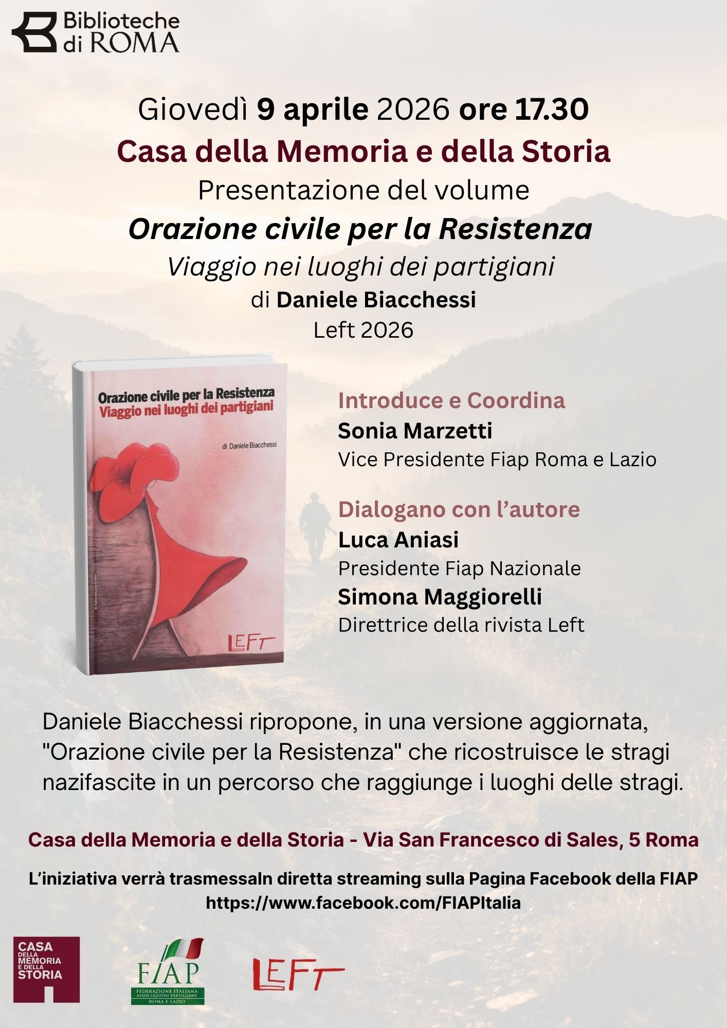 09/04/25. Roma, Casa della memoria, ore 17. Daniele Biacchessi presenta la nuova edizione del libro "Orazione civile per la Resistenza" edito da Left e destinato agli abbonati della rivista, con Sonia Marzetti, Simona Maggiorelli e Luca Aniasi. Organizzazione: Casa della memoria di Roma.