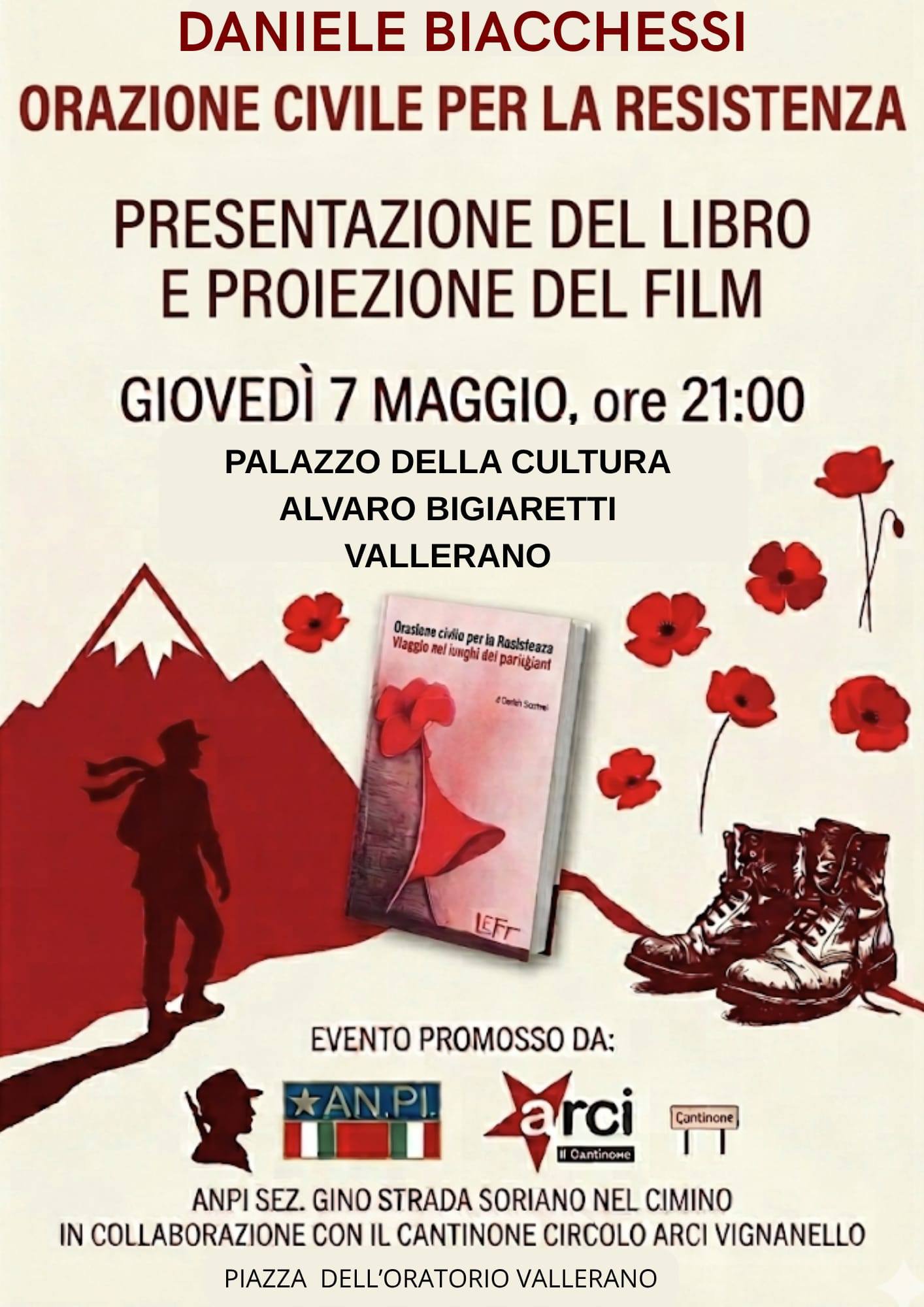 07/05/26. Vallerano, Palazzo della cultura, ore 21. Daniele Biacchessi presenta il libro e il film “Orazione civile per la Resistenza”. Organizzazione:Anpi sezione Gino Strada Soriano del Cimino, Circolo Arci Il Cantinone, Resist.