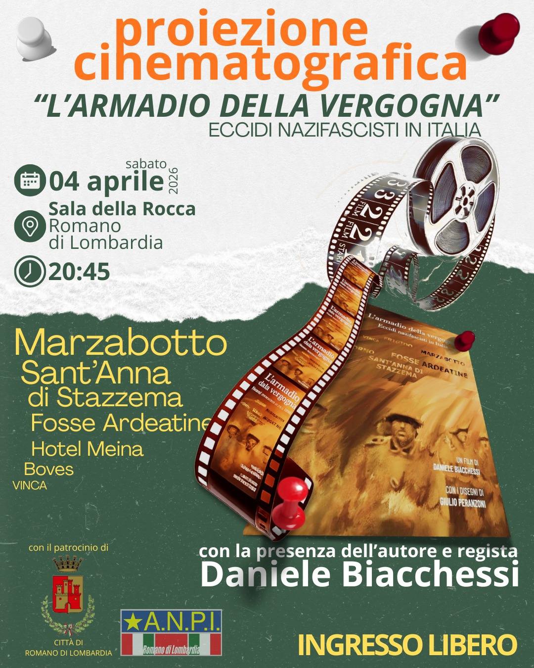04/04/26. Romano di Lombardia (Bergamo), Sala della Rocca viscontea, ore 20,45. Daniele Biacchessi presenta il suo film “L'armadio della vergogna”, i libri "Eccidi nazifascisti" e “Orazione civile per la Resistenza”. Organizzazione: Anpi Romano di Lombardia.