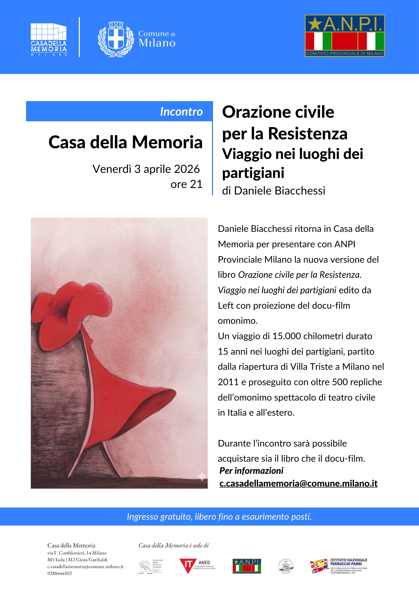 03/04/26. Milano, Casa della memoria, ore 21.  Daniele Biacchessi presenta la nuova versione del libro "Orazione civile per la Resistenza" edito da Left e destinato agli abbonati della rivista e la proiezione del film omonimo . Organizzazione: Anpi Milano provinciale, Casa della memoria.