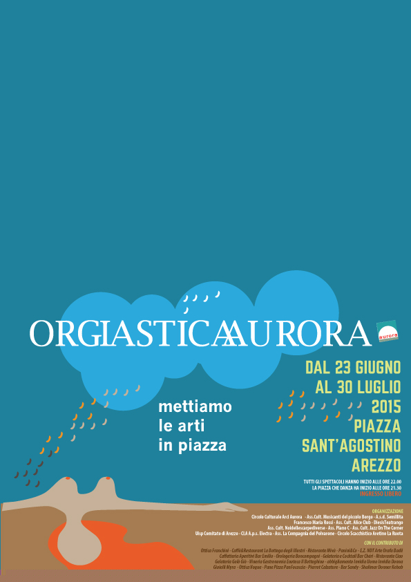 presenta la V Edizione di OrgiasticAurora 2017 – Mettiamo le arti in piazza - L'Aurora ha 30 anni !!!, che anche per quest'anno si svolgerà in Piazza Sant’Agostino ad Arezzo, sede storica del Circolo, dal 2 al 26 luglio 2017.