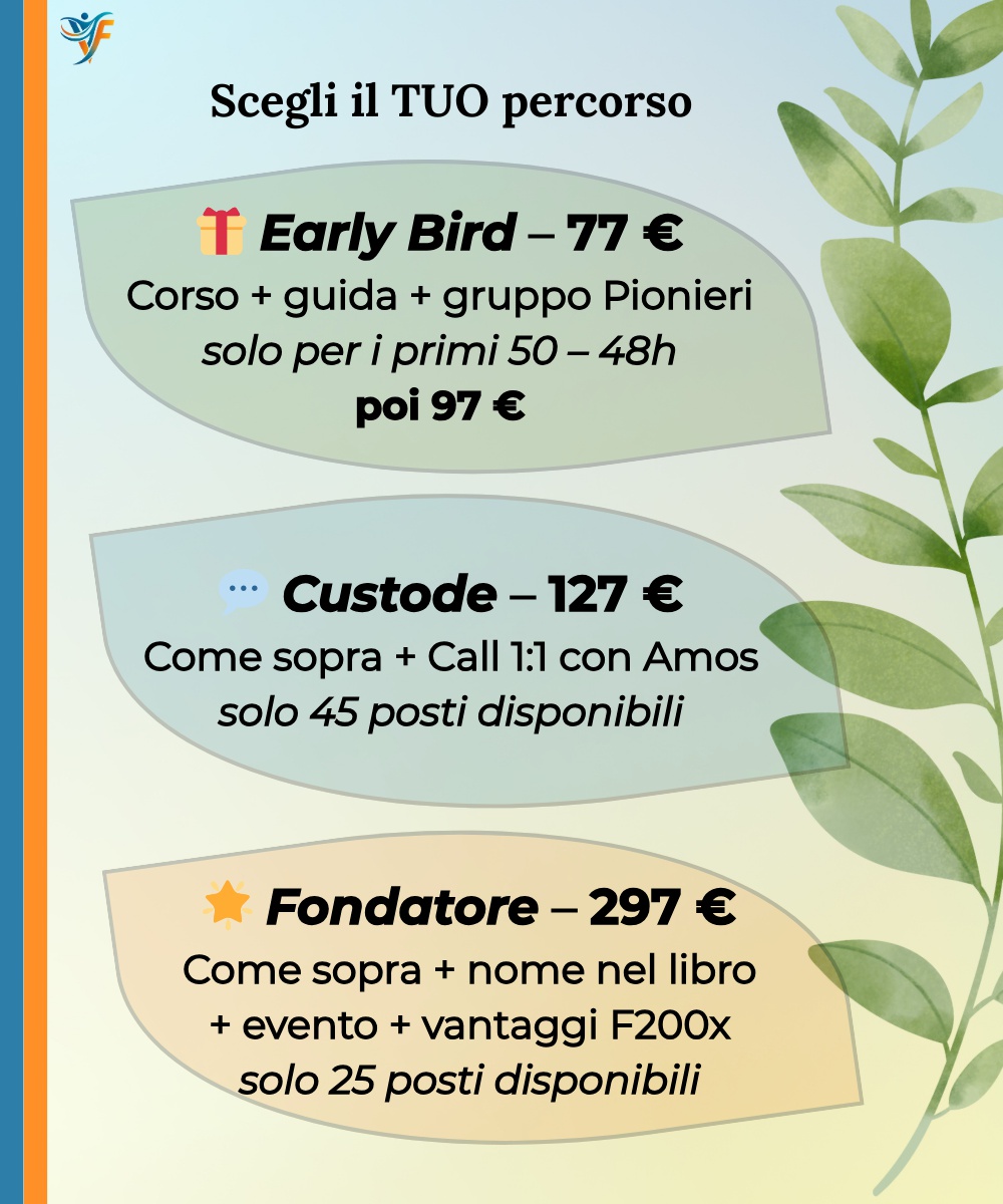 Oppure Custode 127 € o Fondatore 297 € (evento esclusivo + nome nel Libro dei Pionieri).