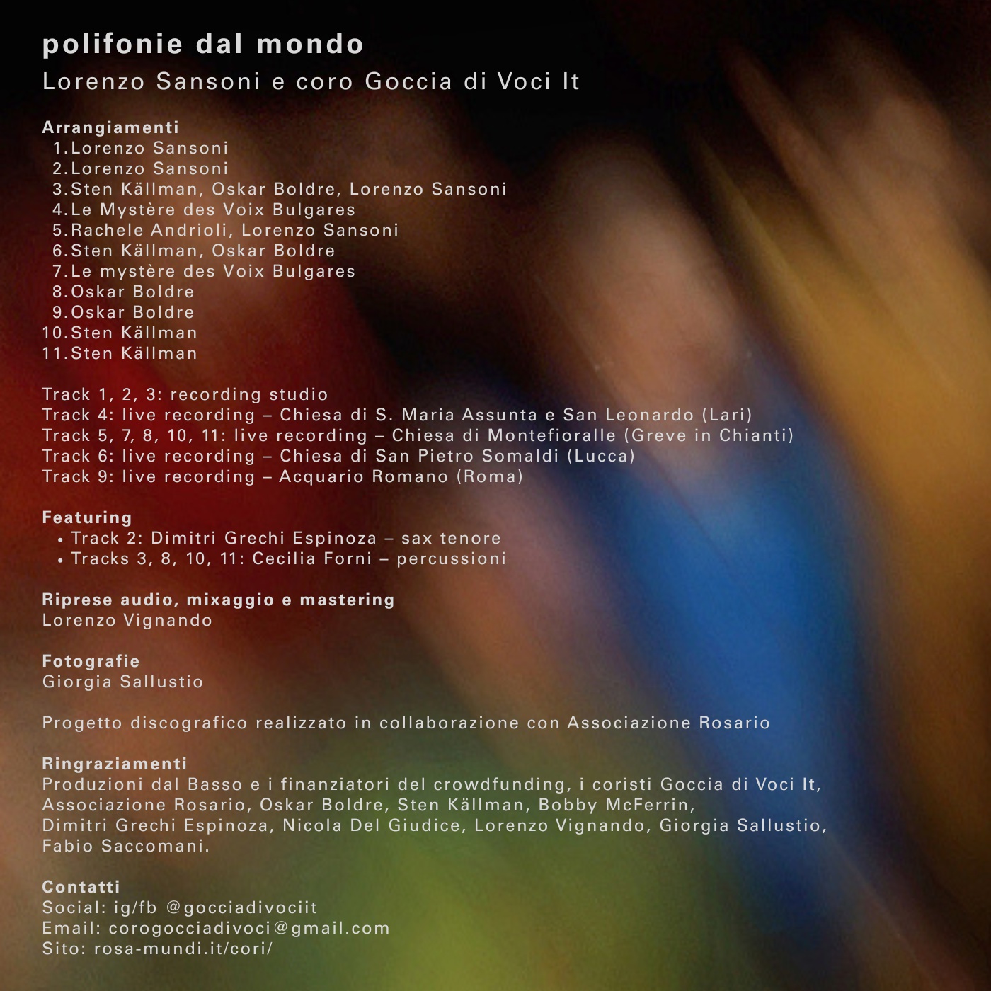 Tre brani sono stati registrati in studio, uno dei quali vede la partecipazione straordinaria del sassofonista Dimitri Grechi Espinoza. Gli altri provengono da registrazioni dal vivo, catturate durante i nostri concerti in location suggestive, dove l’energia condivisa del canto diventa palpabile.