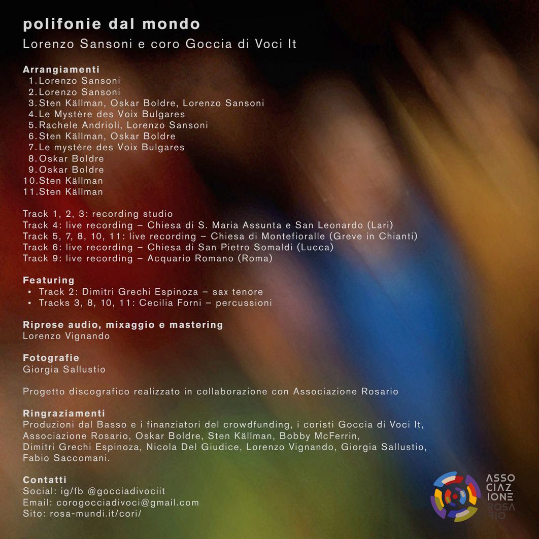 L’album Polifonie dal mondo comprende undici brani provenienti da culture diverse, reinterpretati e riarrangiati per coro polifonico misto.