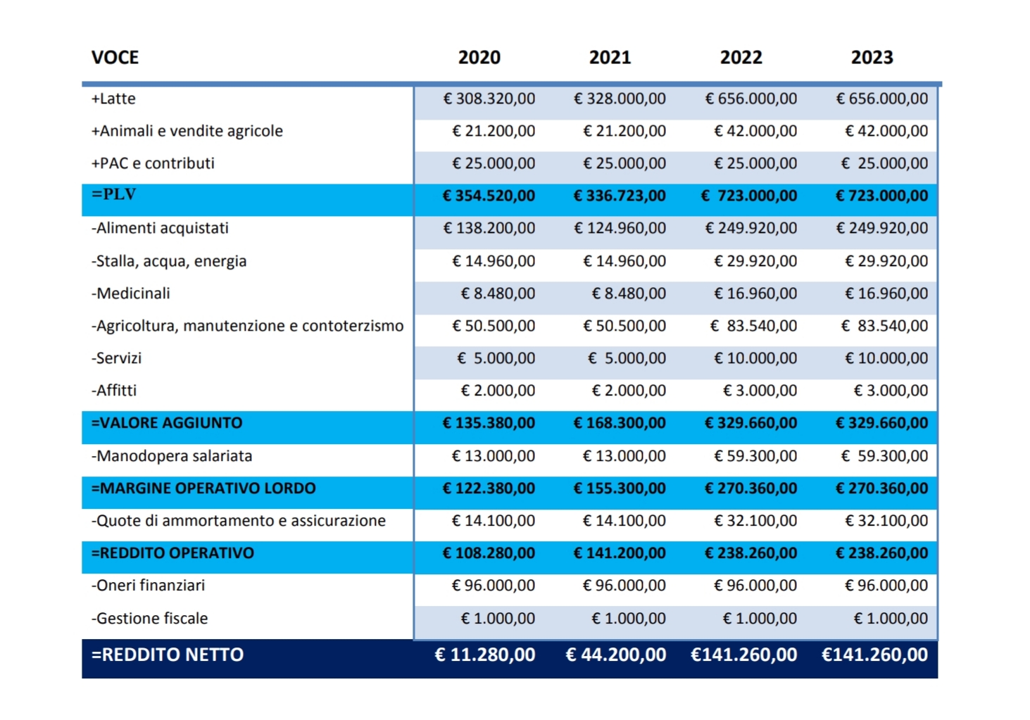 I bilanci previsionali sono stati realizzati sull’attuale prezzo del latte di circa € 41,00 ad HL. Ovviamente tale dato, nonostante sia indipendente dai risultati tecnico-economici aziendali, influisce profondamente