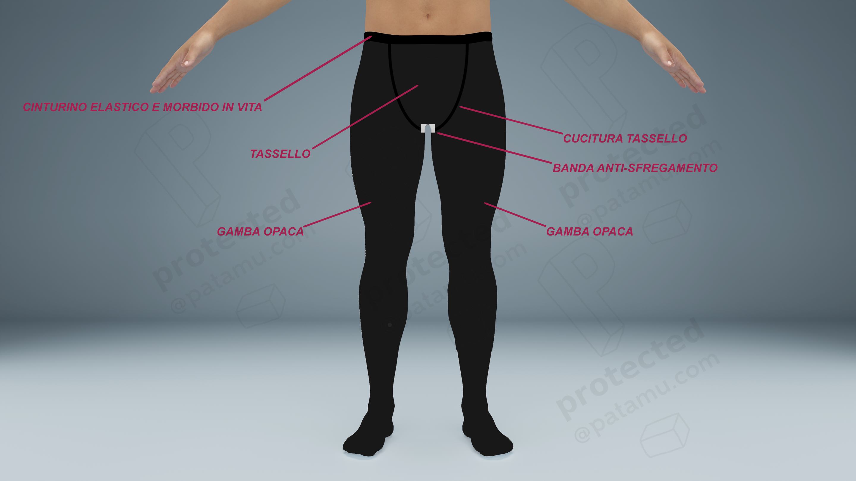 Questo modello è pensato anche per tutti gli altri generi (donne, transgender, non binari, etc.) ed è abbinabile con qualsiasi capo di abbigliamento (gonne, pantaloni corti, etc.). Indossando il collant con la cucitura centrale rivolta in avanti (girando semplicemente il capo), la vestibilità risulta comoda anche per chi ha un’anatomia diversa. Questo rende il prodotto realmente inclusivo.