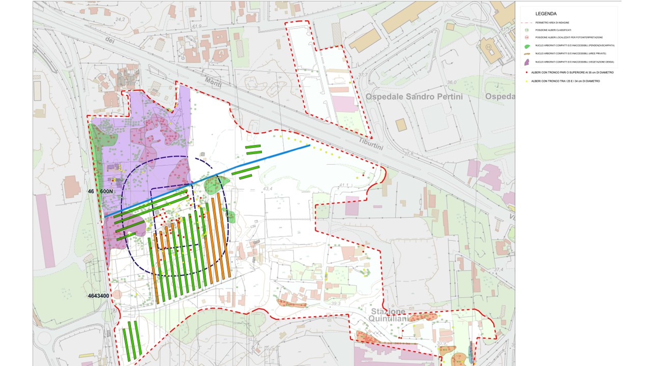Nel documento "TAVOLA RILIEVO ARBOREO ED INDAGINI ARCHEOLOGICHE" , è possibile osservare la grandezza e la lunghezza delle trincee necessarie all'esecuzione delle indagini archeologiche e la presenza di ALBERI DI PREGIO, indicati con puntini gialli o rossi, aventi tronchi di diametro superiore ai 25 cm o addirittura superiore ai 35 cm, protetti dallo stesso REGOLAMENTO DEL VERDE DEL COMUNE DI ROMA, che ne certifica la tutela per legge e l'impossibilità di abbatterli se non per motivi di sicurezza o di salute. Queste osservazioni devono essere descritte all'interno di perizie rese da personale qualificato, ad oggi mai prodotte o ricevute dal DIPARTIMENTO TUTELA AMBIENTALE del Comune di Roma, come riportato nel riscontro al nostro accesso agli atti .