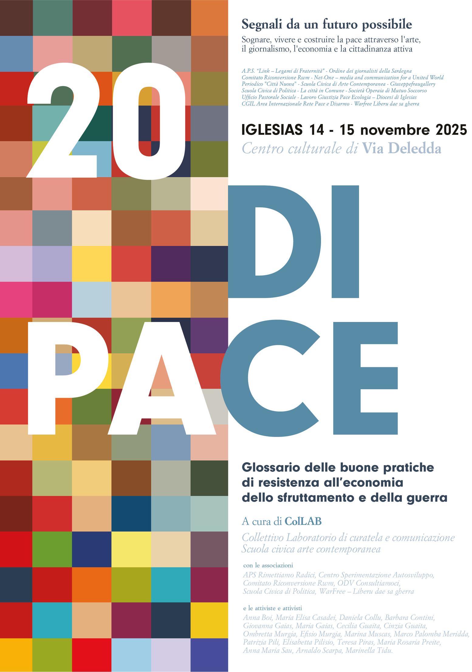 Il 14 e il 15 novembre, presso il Centro culturale di Iglesias, in occasione dell’evento Segnali da un futuro possibile, si terrà la mostra d’arte contemporanea 20 DI PACE - Glossario delle buone pratiche di resistenza all’economia dello sfruttamento e della guerra, un lavoro corale che intreccia arte e attivismo per raccontare le forme di resistenza civile nel Sud Sardegna.