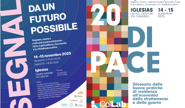Il 14 e il 15 novembre, presso il Centro culturale di Iglesias, in occasione dell’evento Segnali da un futuro possibile, si terrà la mostra d’arte contemporanea 20 DI PACE - Glossario delle buone pratiche di resistenza all’economia dello sfruttamento e della guerra, un lavoro corale che intreccia arte e attivismo per raccontare le forme di resistenza civile nel Sud Sardegna.