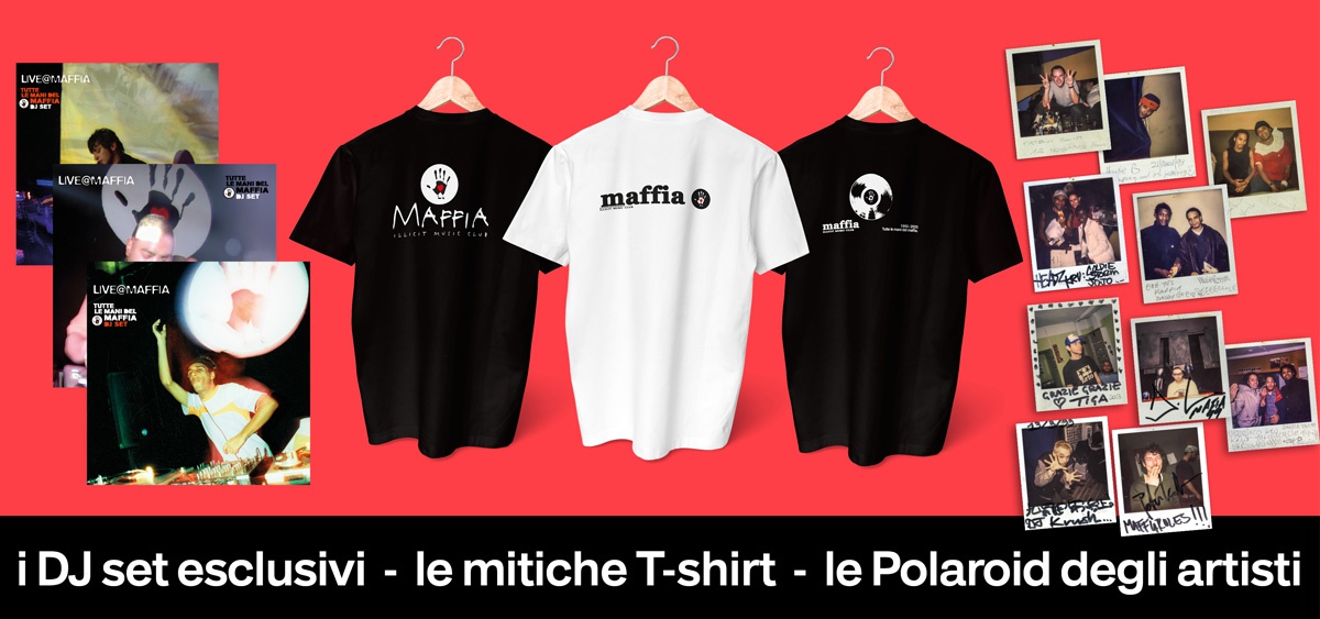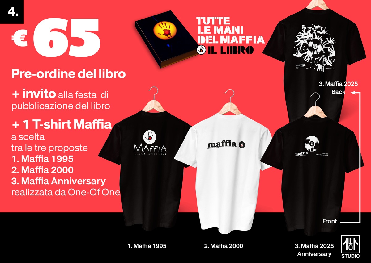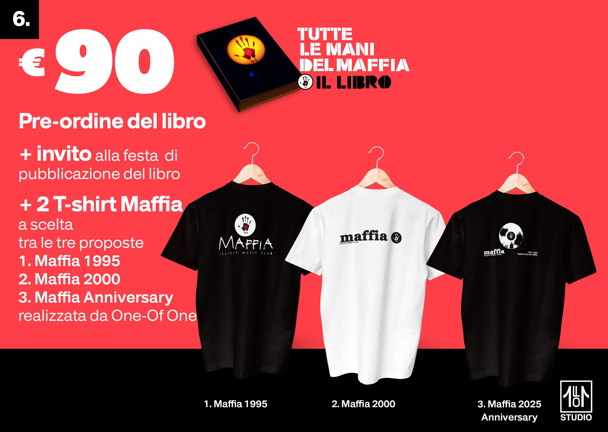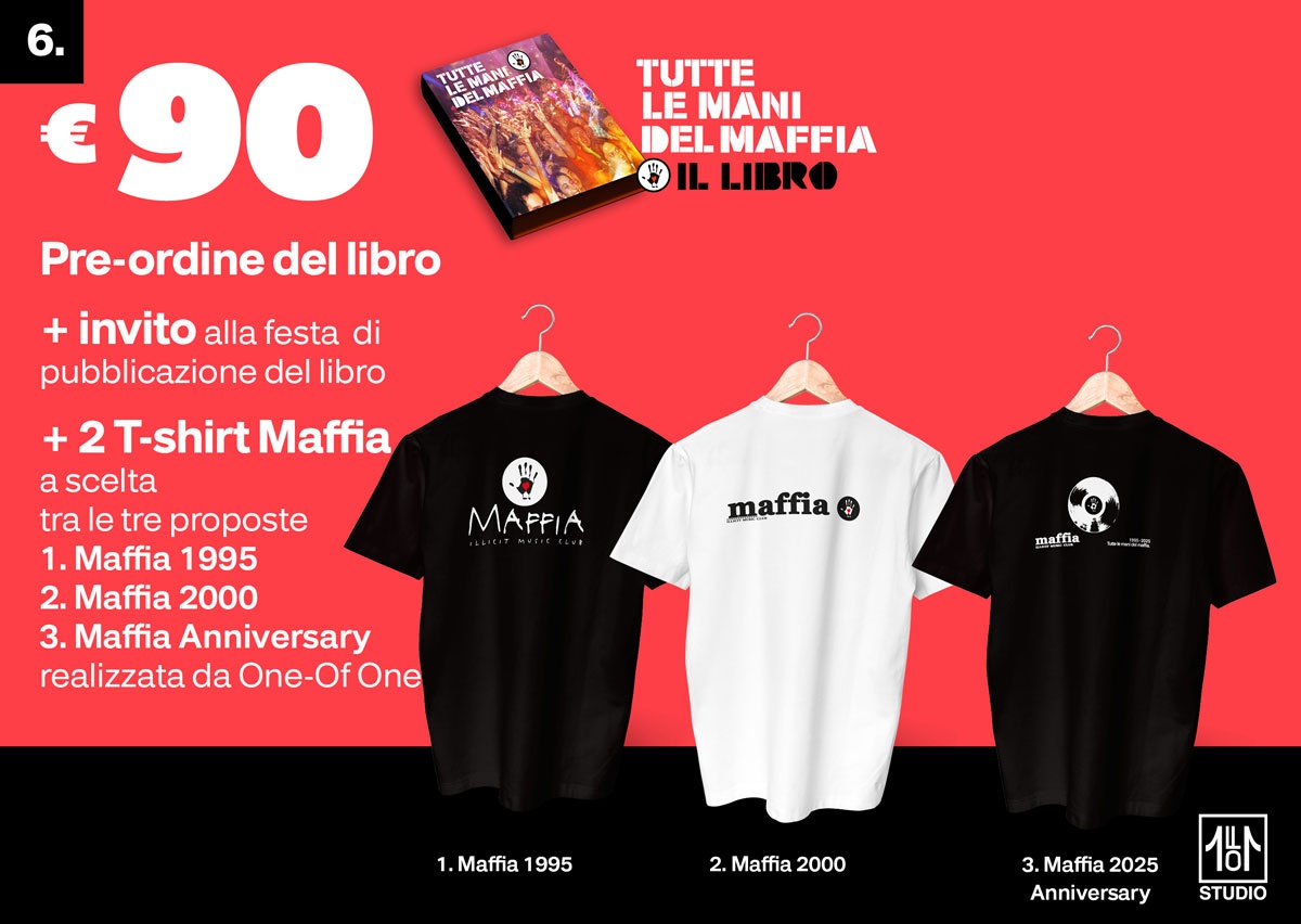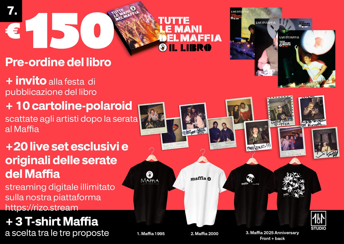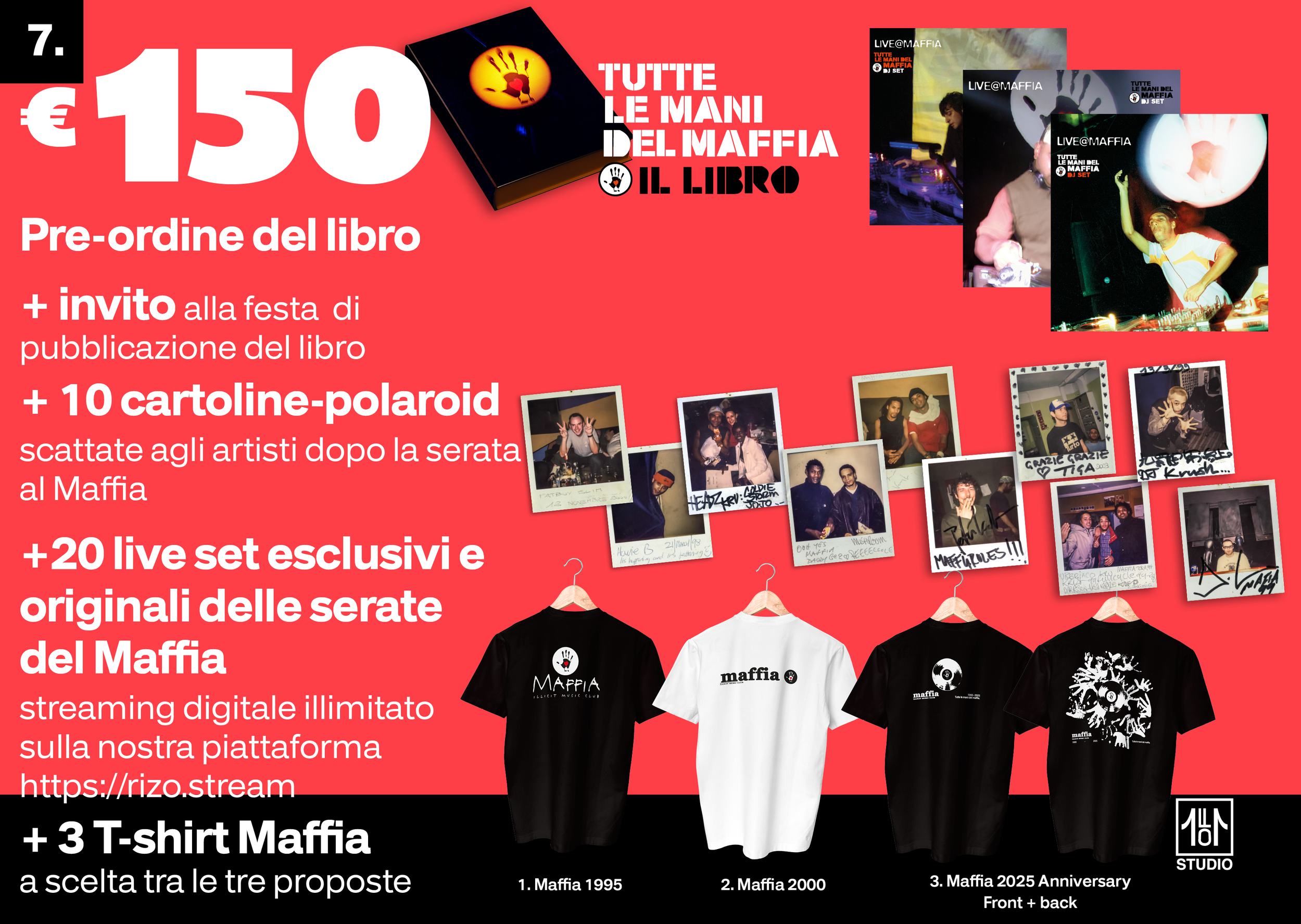Pre-ordine del libro + invito alla festa di pubblicazione del libro + 3 T-shirt del Maffia a scelta tra tre proposte unisex (specificare taglia: S-M-L-XL-XXL) + 10 cartoline polaroid scattate a fine serata + 20 live set esclusivi e originali delle serate del Maffia in streaming digitale illimitato sulla nostra piattaforma Rizostream (https://rizo.stream/)